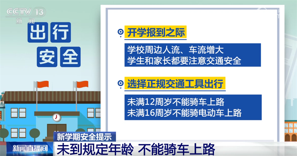 开学报到之际,学校周边人流、车流增大,学生和家长都要注意交通安全。选择正规交通工具出行。未满12周岁不能骑车上路,未满16周岁不能骑电动车上路。