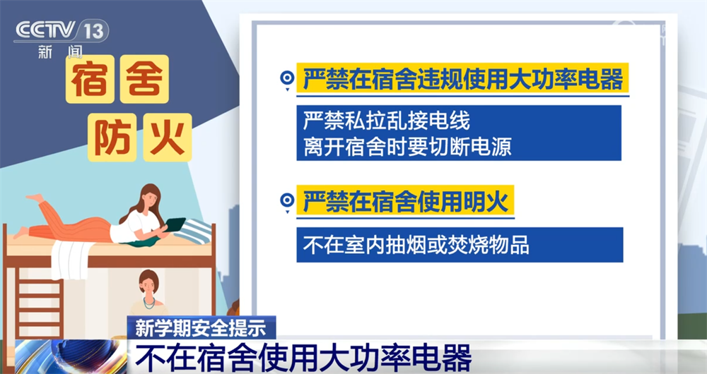 严禁在宿舍违规使用大功率电器,严禁私拉乱接电线,离开宿舍时要切断电源。严禁在宿舍使用明火,不在室内抽烟或焚烧物品。