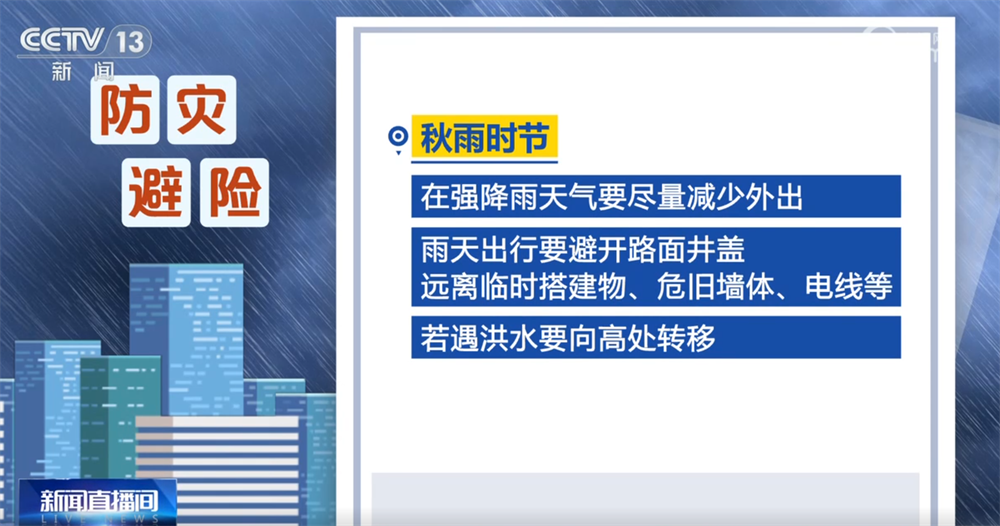 秋雨时节,在强降雨天气要尽量减少外出,雨天出行要避开路面井盖,远离临时搭建物、危旧墙体、电线等,若遇洪水要向高处转移。