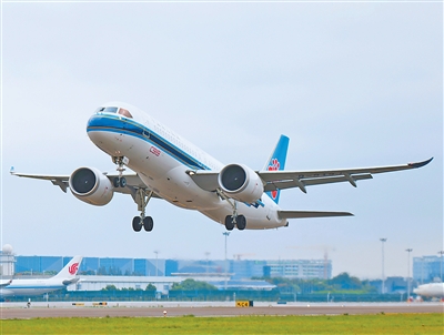 浙江省杭州市,南航国产C919客机从萧山国际机场起飞,飞往广东广州。C919实现从首飞到首航,再到常态化商业运营,目前累计获得国内外订单超1000架。 龙 巍摄(影像中国)