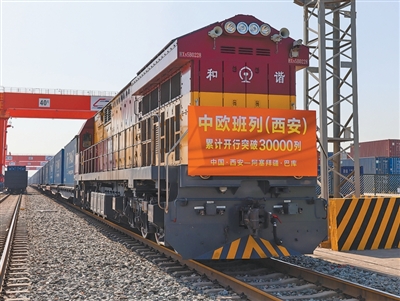 陕西省西安市,满载光伏组件的中欧班列从西安国际港站驶出。 杨静龙摄(影像中国)