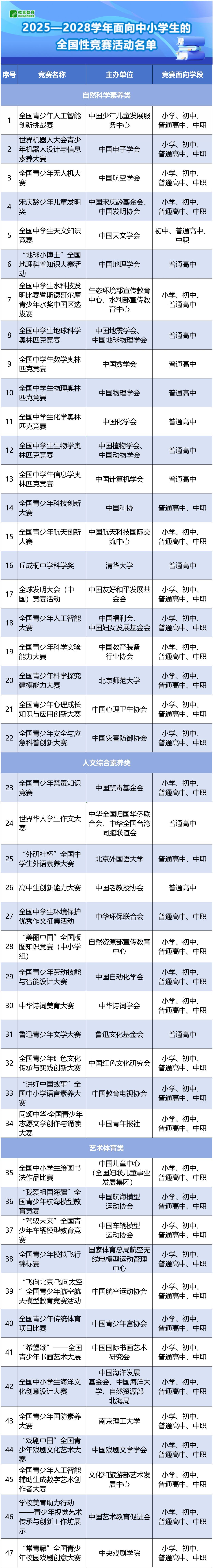 速递!教育部公布2025—2028学年面向中小学生的全国性竞赛活动名单