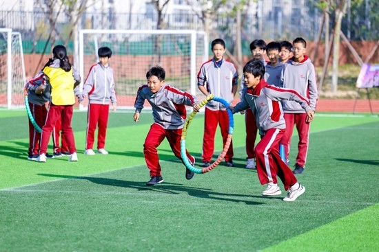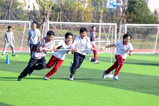 在现场展示环节,师生们展示了“身体瑜伽”“武术练功”“酣畅玩耍”“团体游戏”“全员班赛”五大主题活动。“身体瑜伽”通过箱式呼吸、基础体式、双人瑜伽及冥想练习等帮助女生在身心舒展中建立联结;“武术练功”围绕双人角力激活、直拳转身横击等拳法、鞭腿顶膝等腿法、你攻我防组合及人靶练习展开,助力男生宣泄情绪、塑造阳刚气质;“酣畅玩耍”以8-9个游戏串联的小组积分赛形式呈现,抢标志碟、极速翻转等项目让学生在1分钟内实现快速解压;“团体游戏”通过气球舰队攻防战等游戏,将行为规范、人际构建融入趣味对抗,强化学生归属感与凝聚力;“全员班赛”由五个班级学生分为两批依次参与旋风跑、营救队友项目,在跨班协作中深化团队意识、领悟共赢价值。