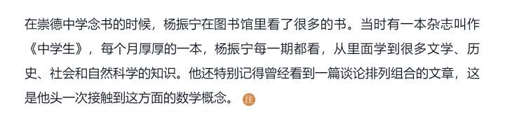 杨振宁先生自幼喜欢阅读,《中学生》杂志就是他上中学时常读的一本杂志。在《杨振宁传》中,有这样一段话:当时有一本杂志叫作《中学生》,每个月厚厚的一本,杨振宁每一期都看,从里面学到很多文学、历史、社会和自然科学的知识。他还特别记得曾经看到一篇谈论排列组合的文章,这是他头一次接触到这方面的数学概念。