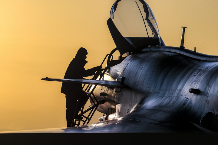 朝阳从地平线跃起,晨曦照耀着列队行进的飞行员们,一次新的起飞即将来临。
