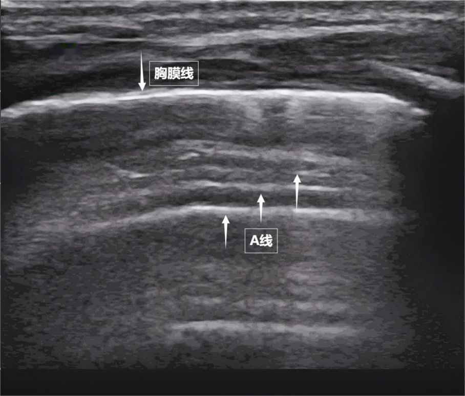当声波穿过胸壁肋骨缝隙,首先会遇到紧贴肺表面的光滑薄膜——壁层胸膜和脏层胸膜。两者紧密相贴,中间没有多余的气体或液体。它们在屏幕上呈现为一条明亮、光滑的水平线,共同构成了胸膜线。这条线就是肺的“海岸线”。在它的下方,由于肺泡内大量气体对声波的强烈反射,会出现一系列与胸膜线平行的、等间距的、重复出现的明亮平行线,像海浪般不断向屏幕深处延伸,这就是A线( 见下图 )。A线是正常含气肺部的典型标志。它的存在直接提示肺表面含气充足,胸膜腔内无异常积液或气体。
