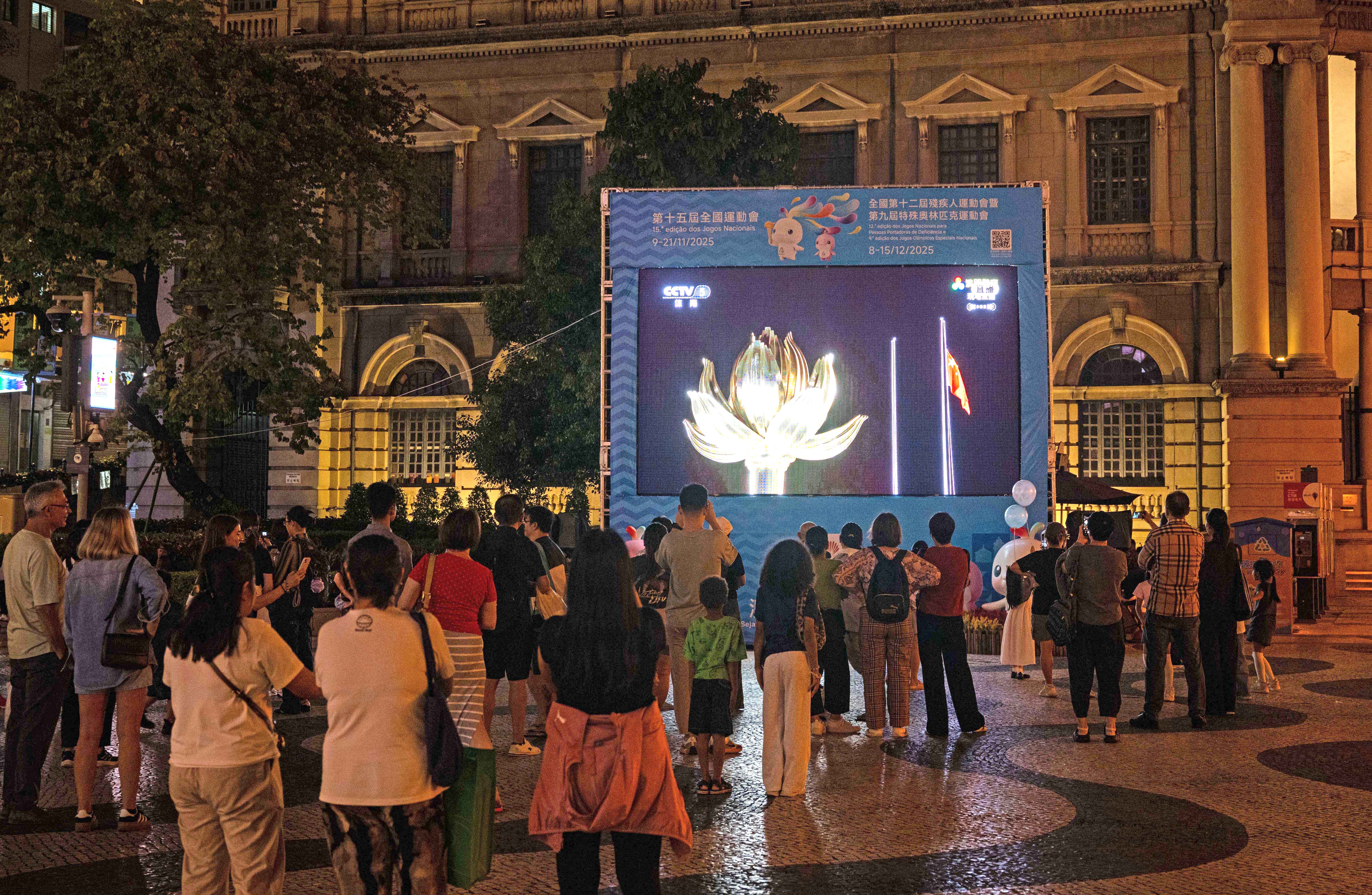 11月9日,第十五届全国运动会开幕式在广东奥林匹克体育中心举行,这是群众在澳门街头观看直播。新华社发(张金加 摄)