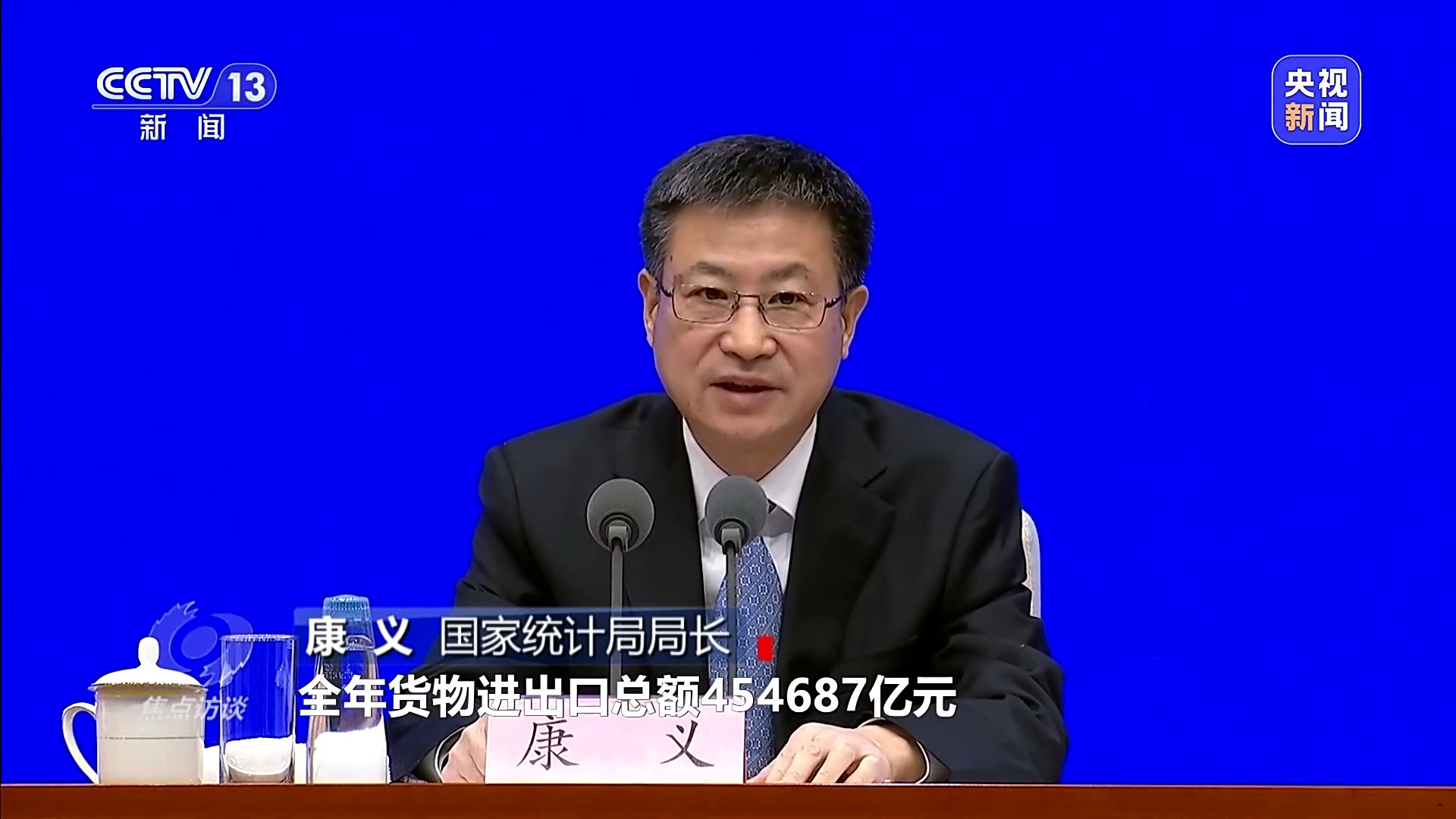 国家统计局局长 康义:全年货物进出口总额454687亿元,比上年增长3.8%,其中,出口269892亿元,增长6.1%,进口184795亿元,增长0.5%。