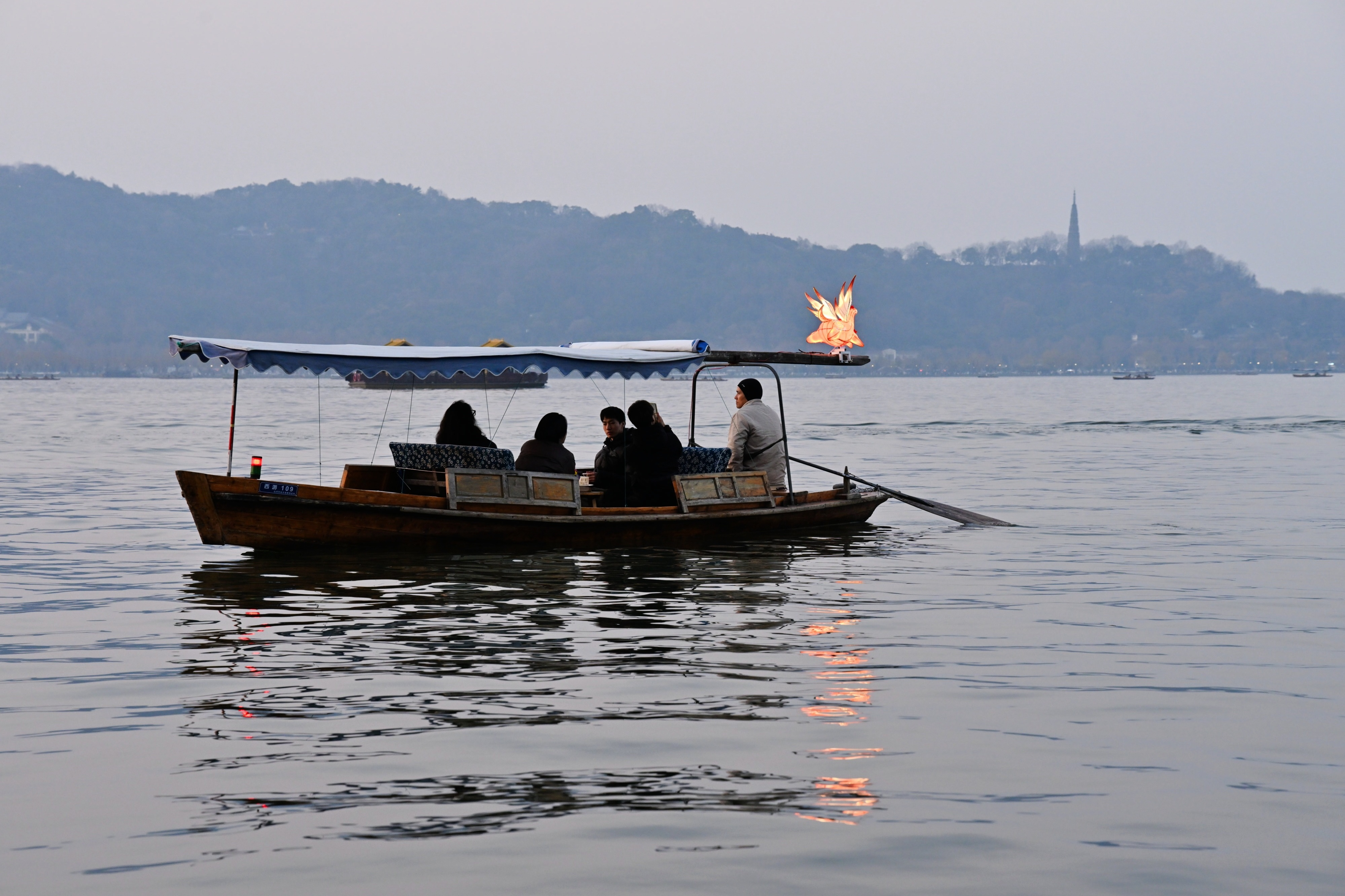 “马灯福气船”成为冬季杭州西湖夜游的一抹亮色。新华社记者段菁菁 摄