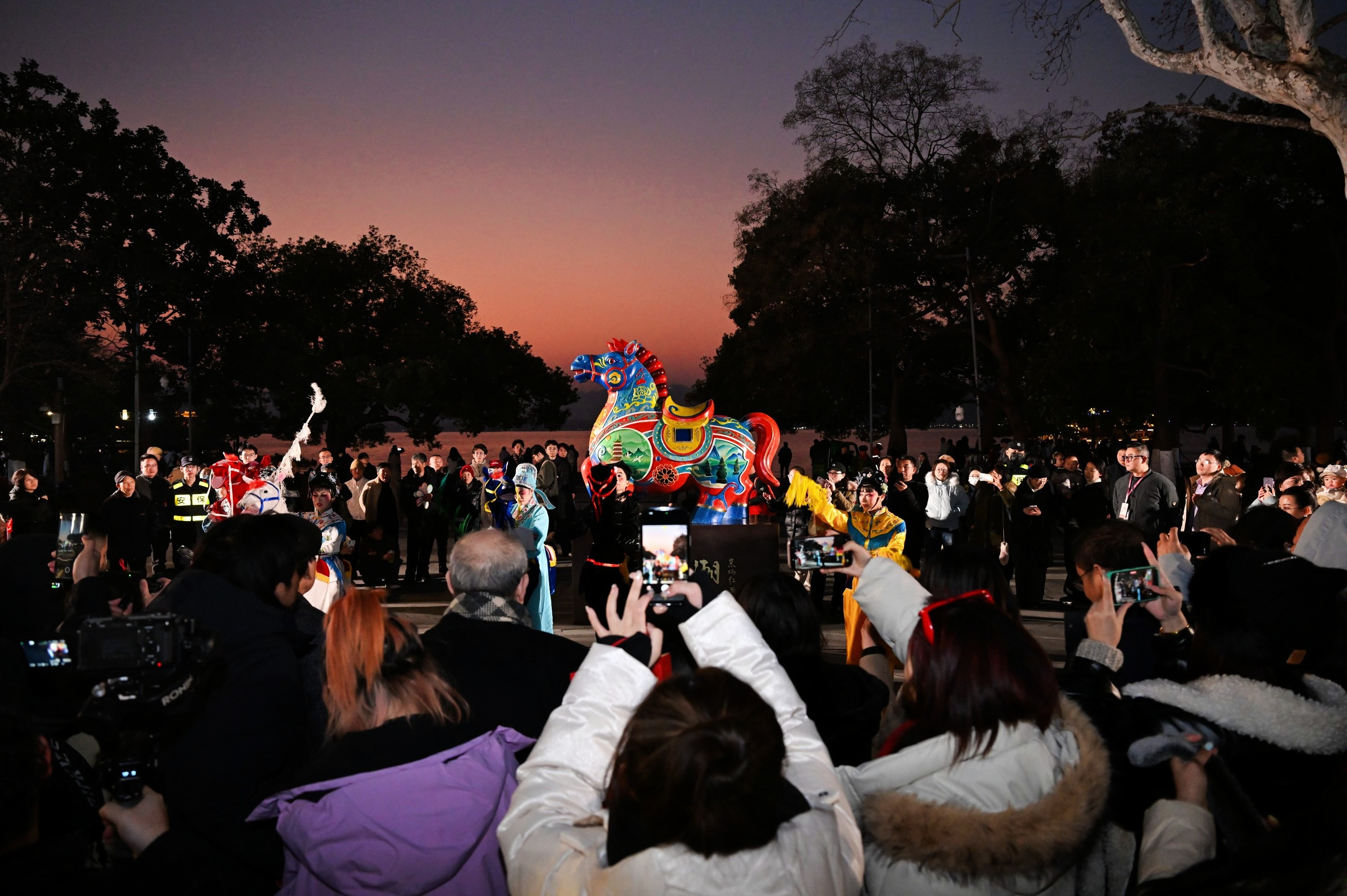 市民游客在西湖边观看“马上钱潮”马年铜雕装置。新华社记者江汉 摄