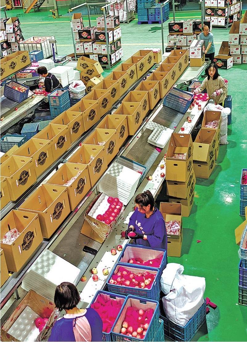 白水县盛隆果业有限责任公司的工厂里,工人在包装苹果(资料照片)。