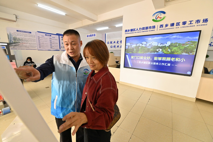 在广西南宁市西乡塘区零工市场,工作人员(左)指导市民查找就业招聘信息(2025年12月10日摄)。新华社记者 陆波岸 摄