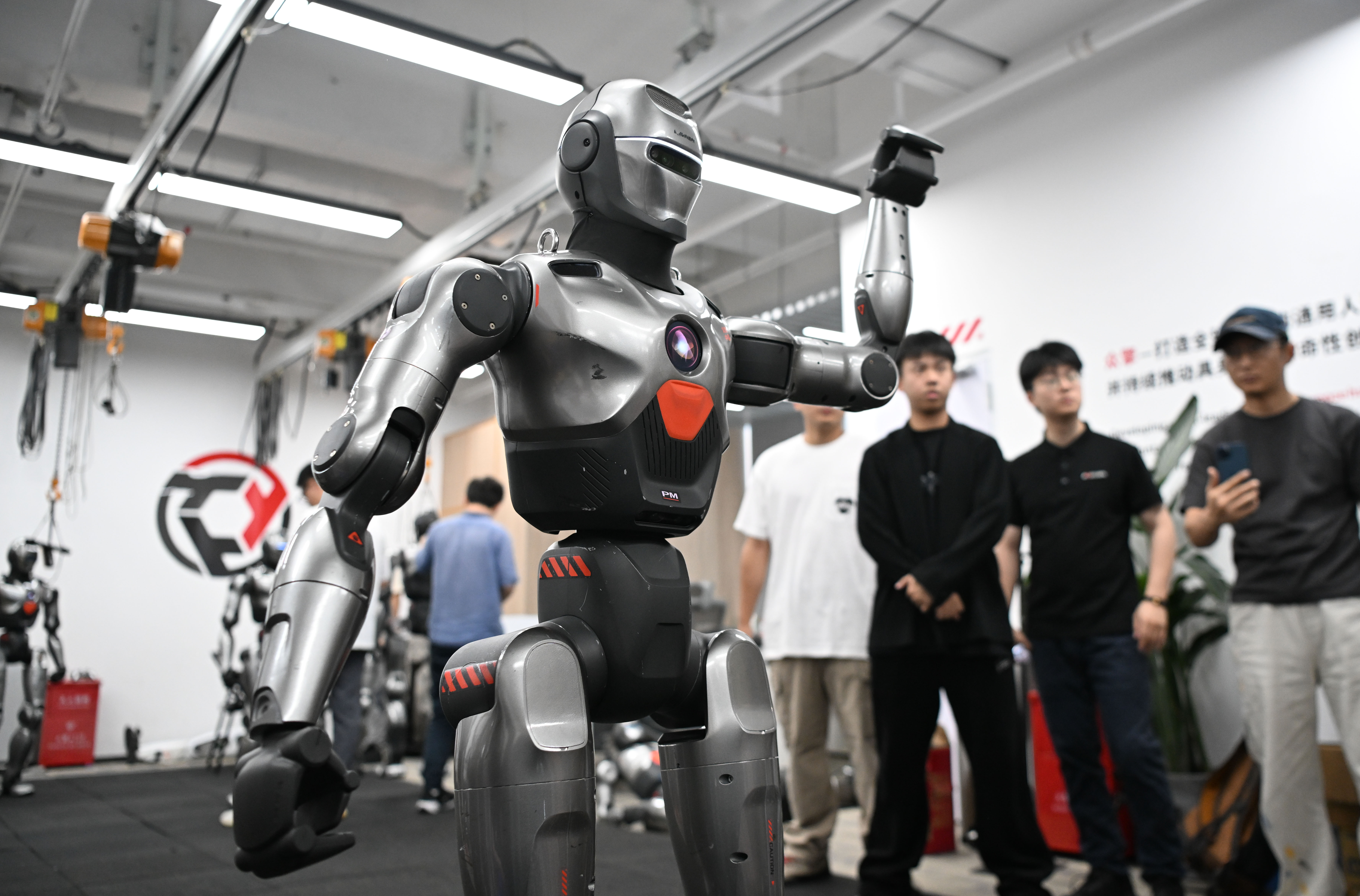 2025年6月25日,在深圳市众擎机器人科技有限公司,人形机器人挥舞手臂致意。新华社记者 邓华 摄