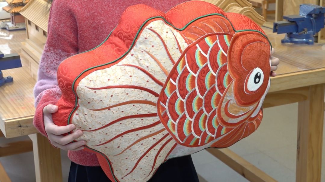 习近平总书记还很关注孩子们对中华优秀传统文化的了解和传承。当看到史家小学学生王羽瑶同学手里拿着一个用“京绣”技艺制作的鱼形靠垫,就饶有兴致地和王羽瑶聊了起来。