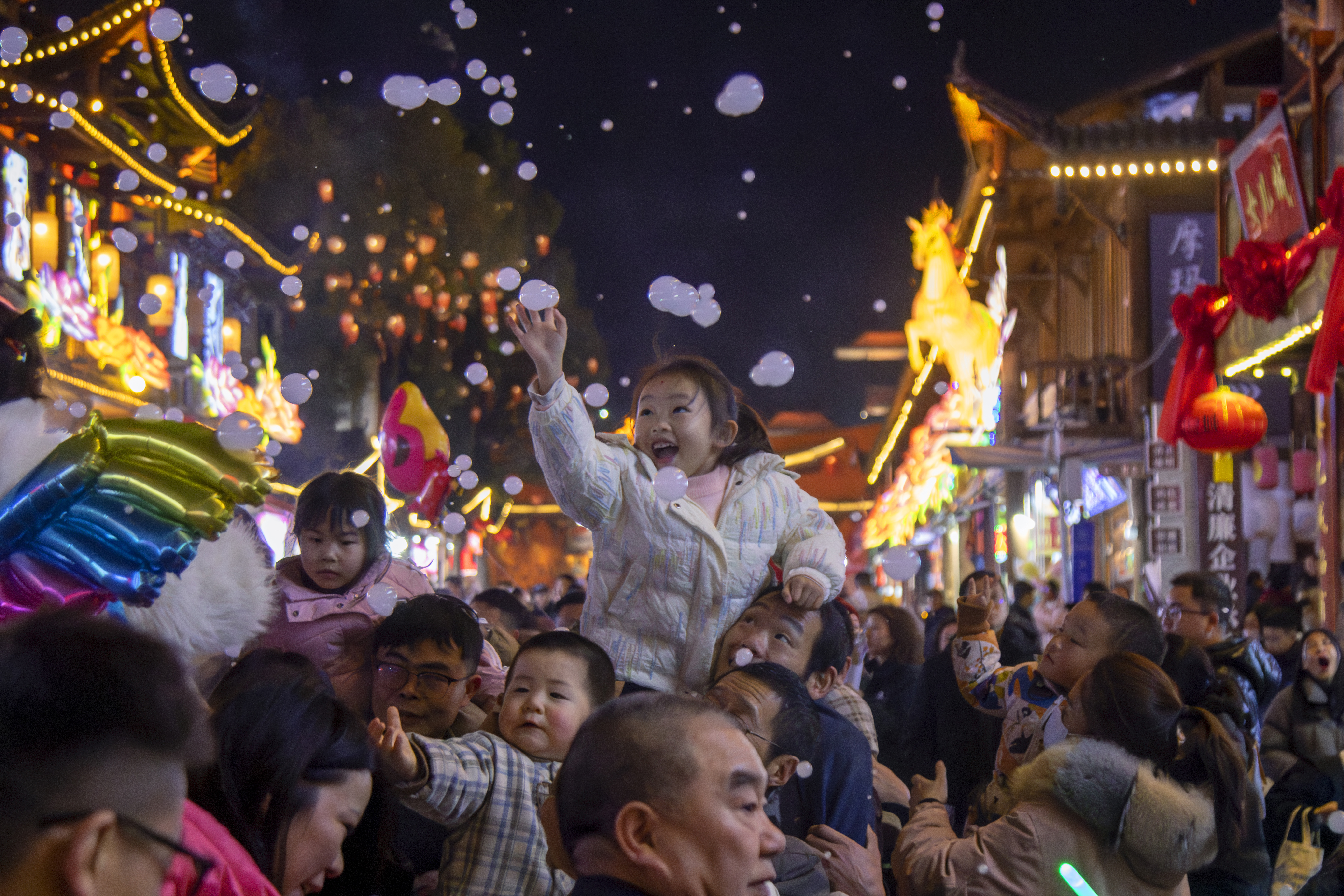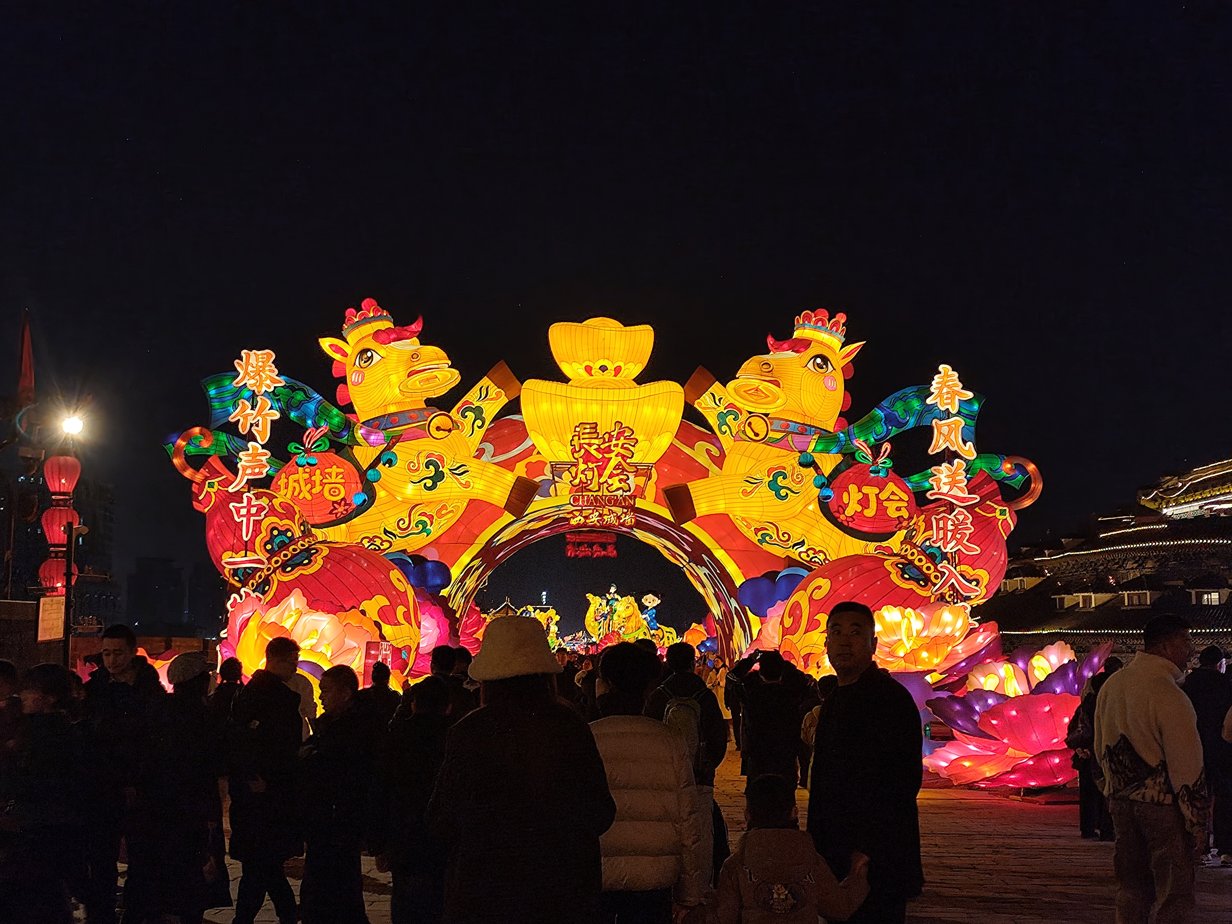 在西安城墙景区,“千灯映长安·午马迎春来”主题灯会璀璨绽放,39匹从历代文物中甄选出的“生肖马”化作“翼马行空”“舞马盛唐”等创意灯组,恢宏古朴的城墙被光影唤醒。