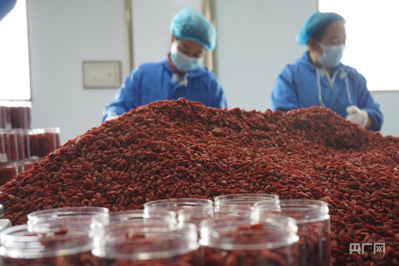 企业生产车间内,鲜红的枸杞正在打包装箱(央广网记者  汪晓青  摄)