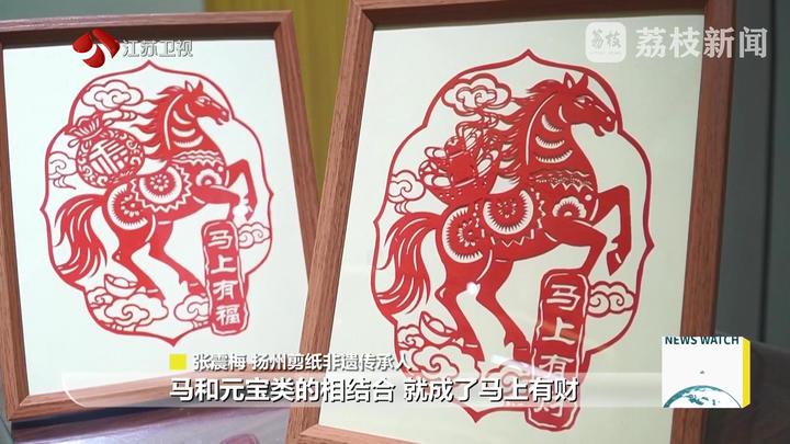 扬州剪纸非遗传承人张震梅说:“马和福字就是‘马上有福’,马和元宝类的相结合就成了‘马上有财’。将我们扬州园林里面窗花的元素也包含在里面。 ”