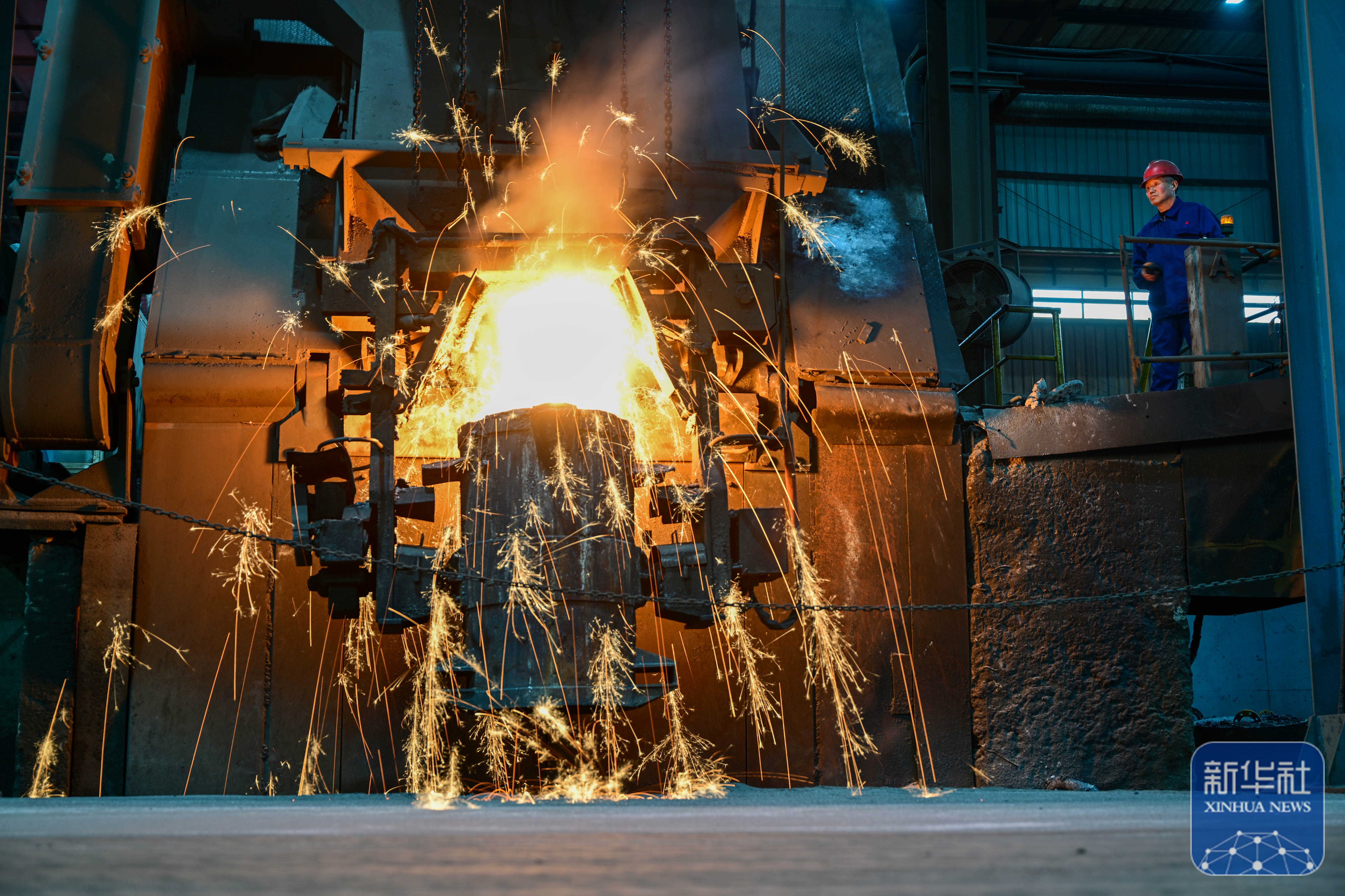 ↑ 2月24日,在江苏省淮安市金湖县海华机械制造有限公司生产车间,工人在遥控设备倒铁水。新华社发(梁德斌摄)