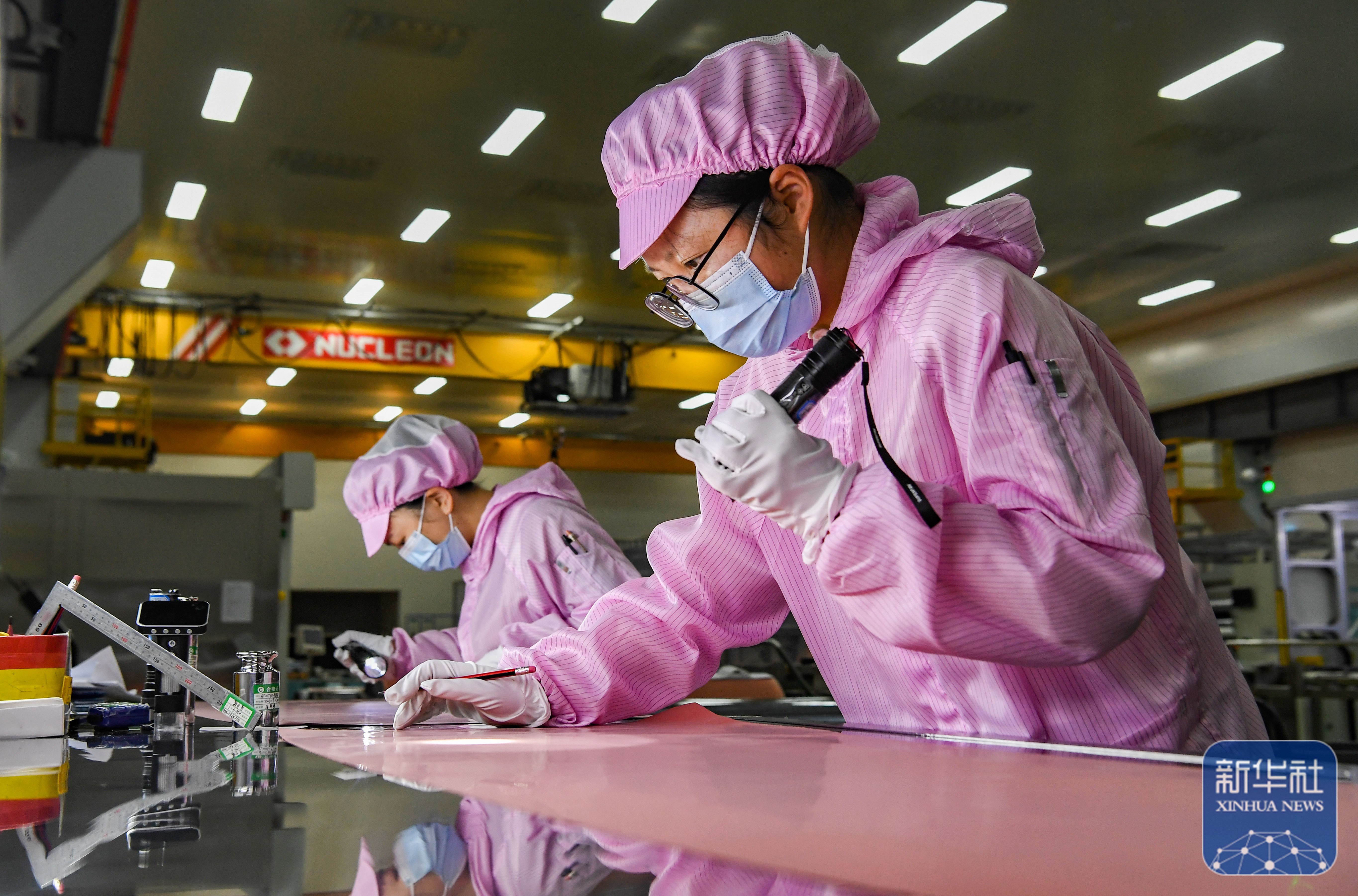 ↑ 2月24日,在浙江省东阳市南马镇浙江花园新能源股份有限公司生产车间,工人在检测高性能铜箔外观。新华社发(时宽兵摄)