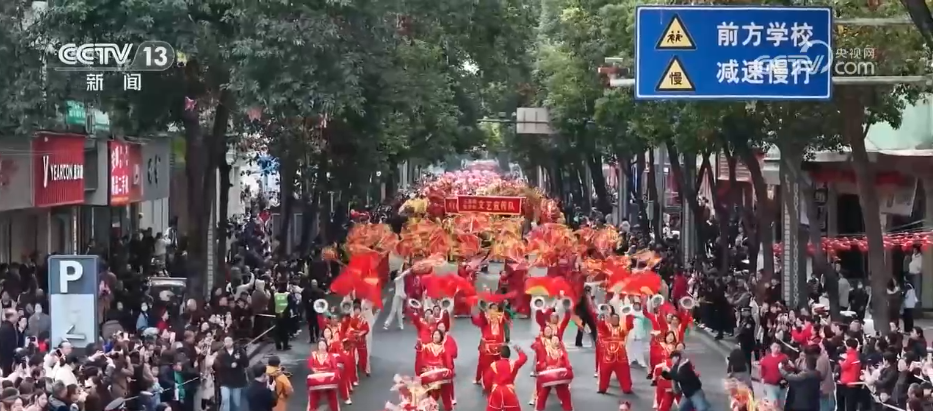 在陕西安康市中心城区,千余名表演者身着彩服,手持彩扇,踩着鼓点一路巡游。舞龙舞狮、花鼓子等传统节目与大道锣鼓、打连钱等地方特色民俗表演轮番亮相,吸引了众多游客和市民驻足观赏。