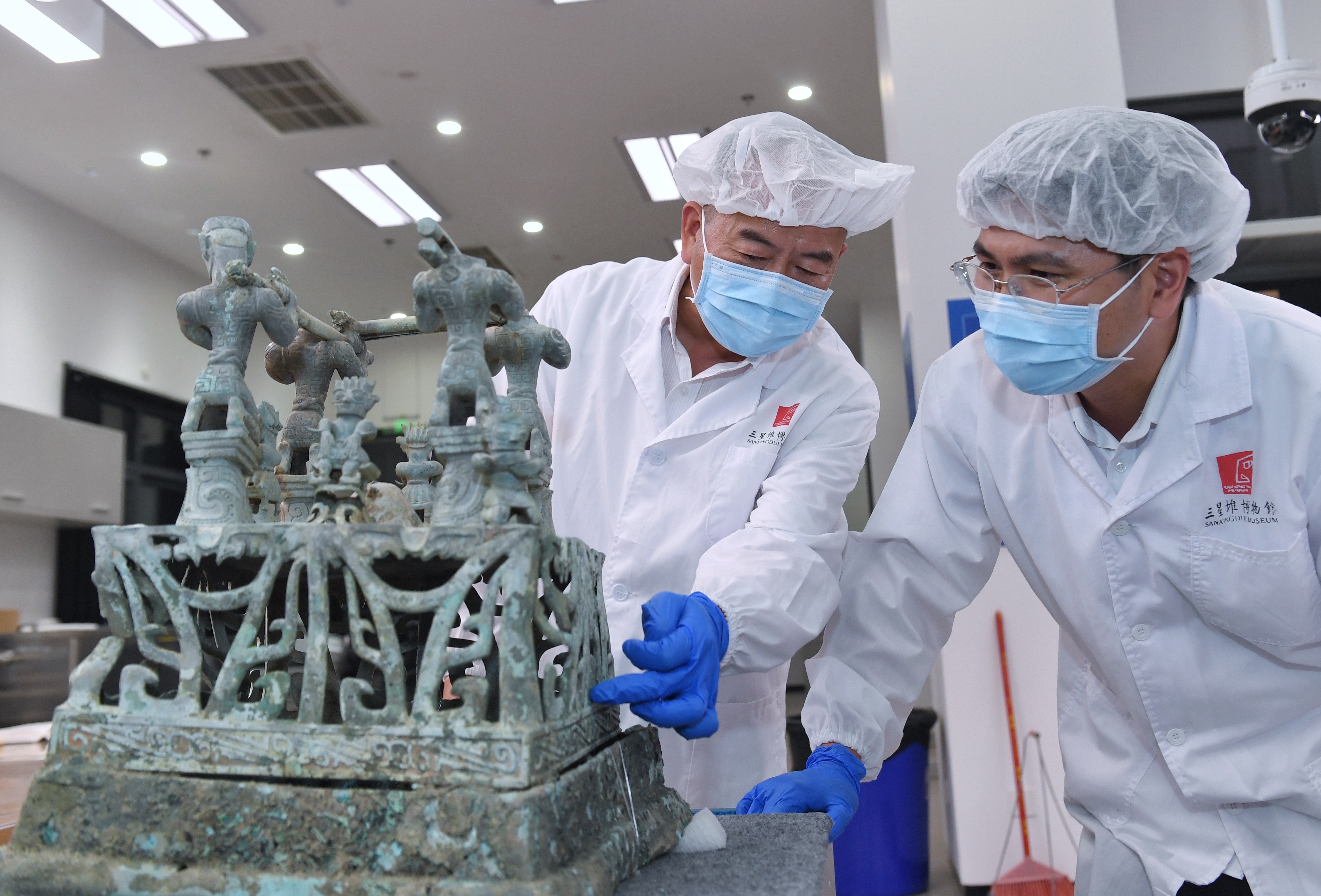 2023年5月30日,在四川三星堆博物馆文物保护和修复中心,文物修复师郭汉中(左)与同事讨论神坛底座修复方案。郭汉中从事文物修复工作已40余年,深度参与了三星堆祭祀坑的发掘工作,累计修复文物6000余件。“大概还有上万件文物等着修复,需要一代接着一代往下干。”郭汉中说,他要把平生所学传承下去,培养更多人才。