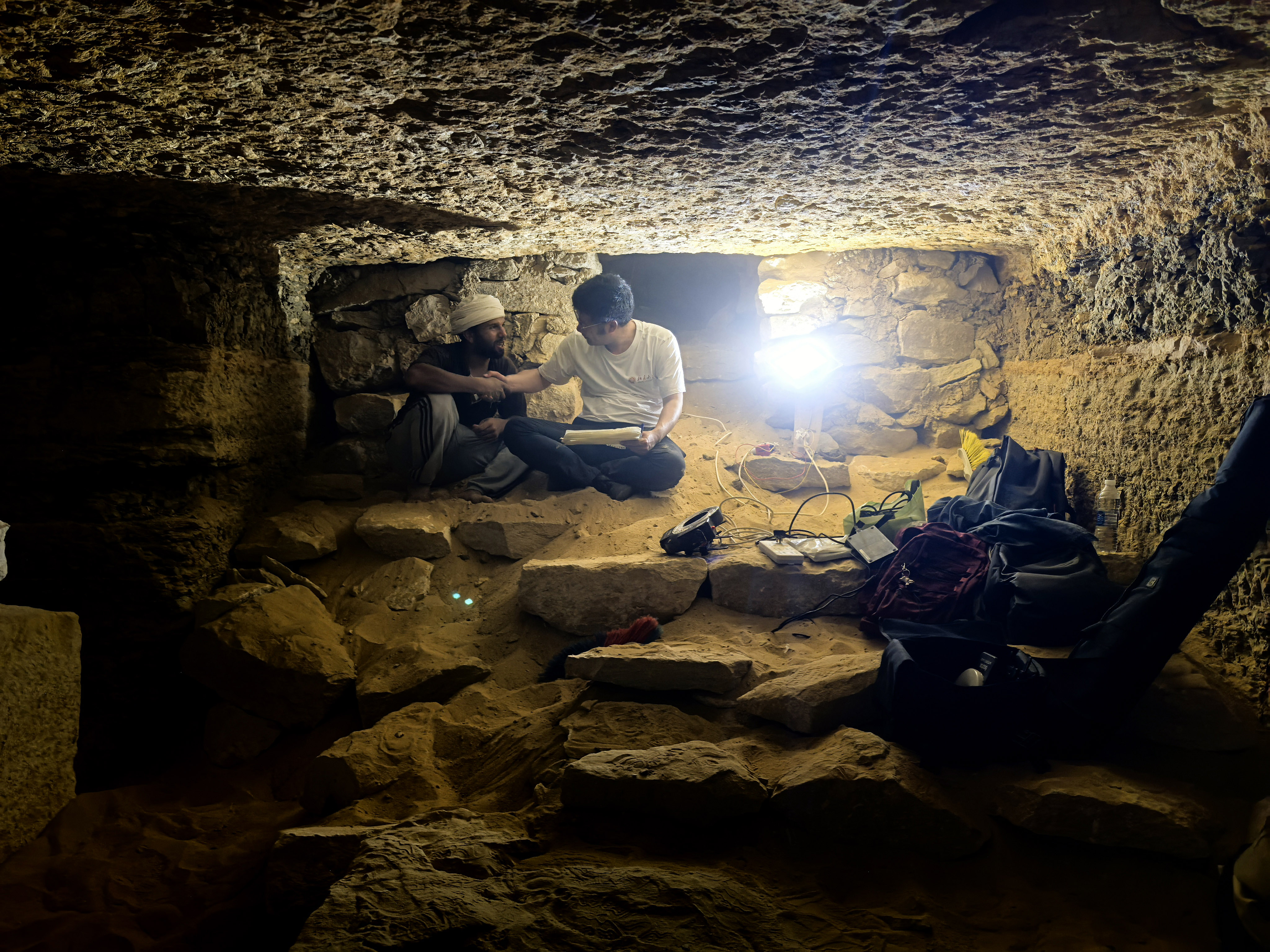 9月16日,在埃及开罗以南的萨卡拉考古遗址区,中埃萨卡拉联合考古项目中方领队薛江(右)和埃方同行在一座贵族墓内工作。(受访者供图)