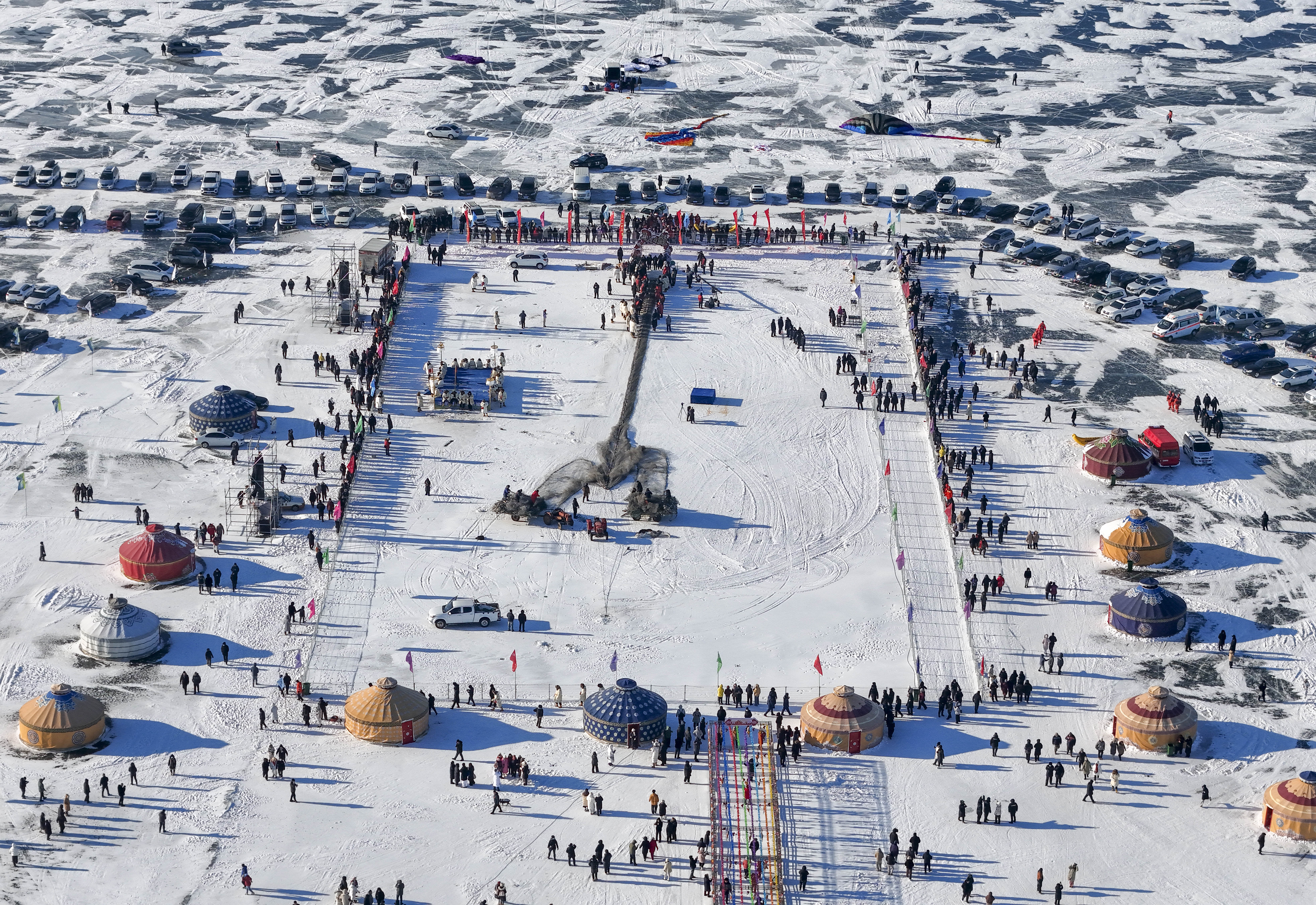 2025年12月27日,黑龙江省大庆市杜尔伯特蒙古族自治县第九届冰雪渔猎那达慕在当地连环湖启幕,这是冬捕出鱼现场(无人机照片)。杜尔伯特蒙古族自治县持续举办冬捕节、国际垂钓大赛等活动,每年因水、因鱼前来旅游的人数达数百万人次,渔文旅融合发展的模式,不仅带动了文旅市场,更拓宽了渔民的增收渠道。