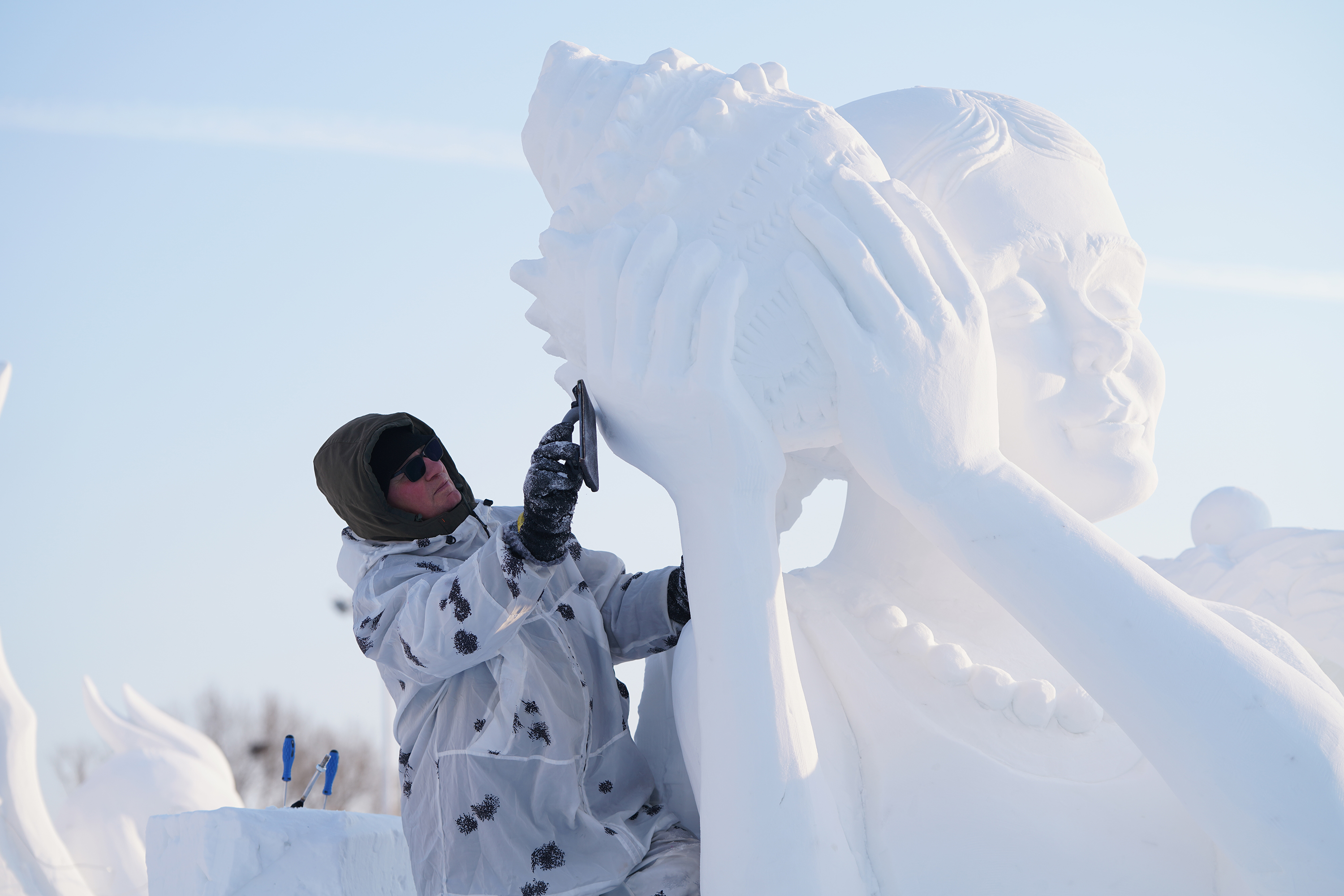 2024年1月8日,参赛选手在第26届中国·哈尔滨国际雪雕比赛中进行雪雕创作。