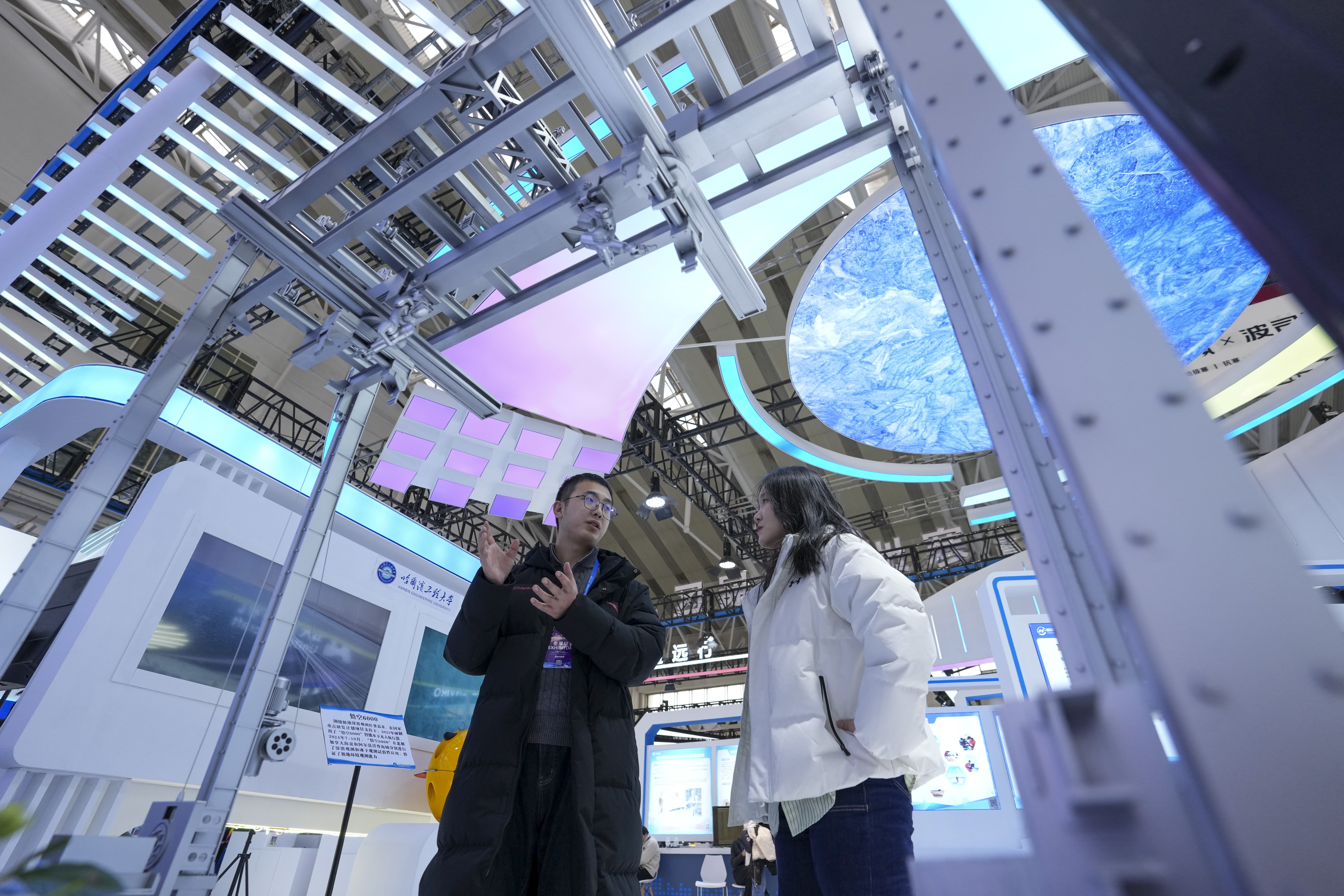 2026年1月6日,在2026哈尔滨国际冰雪经济博览会展会现场,参会嘉宾(左)为参观者介绍智能大型冰雕自动化搭建机器人。本届博览会旨在通过成果展示、产业交流与投资合作,展现“冰雪+经济”“冰雪+科技”等融合发展成果,为全球投资者提供市场机遇。