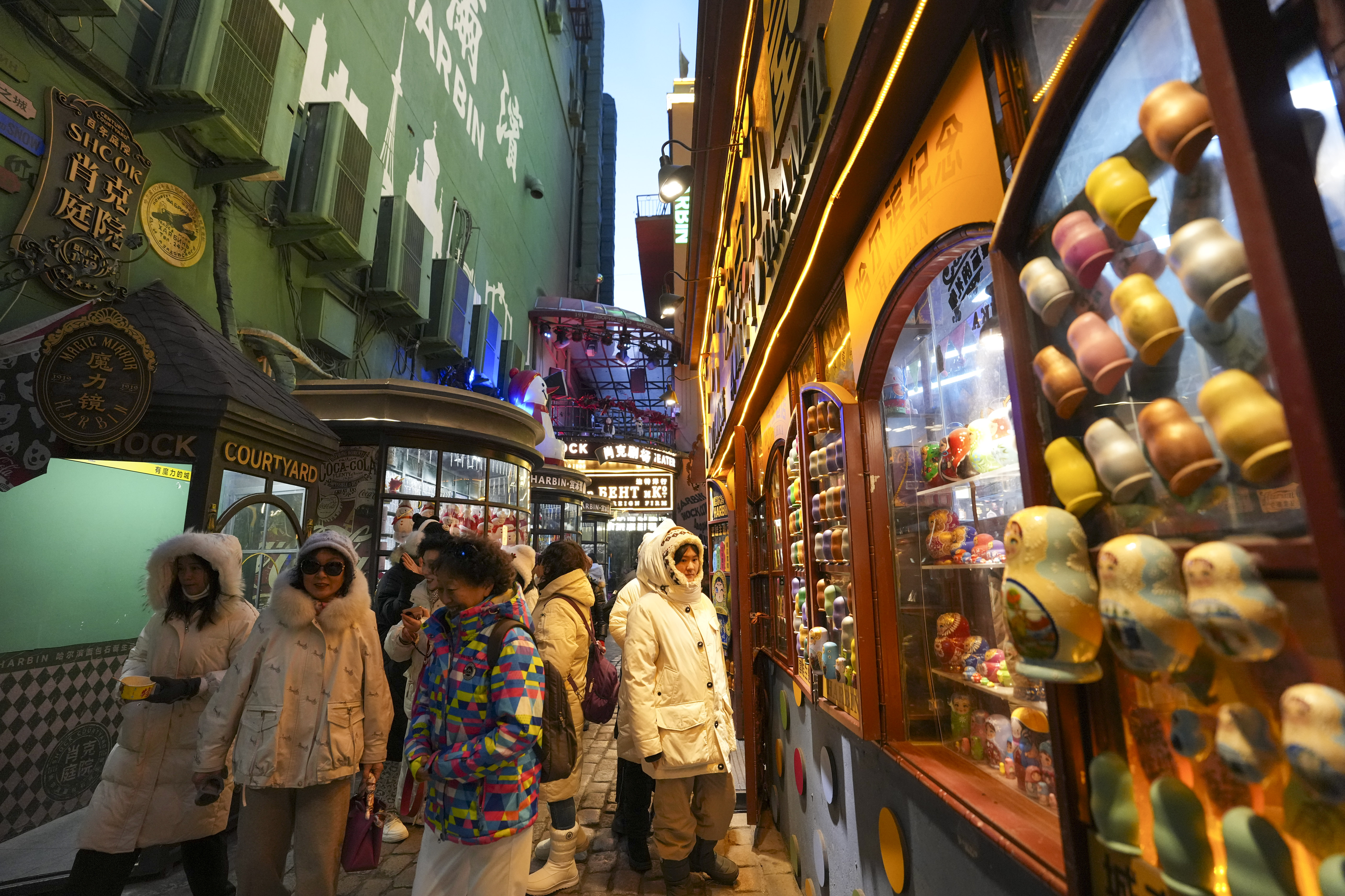 2025年12月16日,人们在哈尔滨中央大街肖克庭院景点参观游览。中央大街始建于1898年,全长1450米,由87万多块“面包石”铺成,被誉为“万国建筑博物馆”。