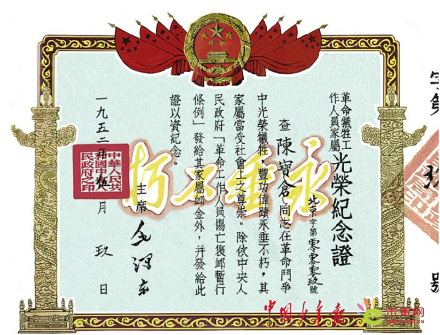 中国少年报·未来网北京11月1日电(记者 凌萌)“查陈宝仓同志在革命斗争中光荣牺牲,丰功伟绩永垂不朽,其家属当受社会上之尊崇。除依中央人民政府《革命工作人员伤亡褒恤暂行条例》发给其家属恤金外,并发此证以资纪念。”在陈宝仓将军外孙女李敏的童年记忆里,家里那面墙上,始终悬挂着这张由毛泽东亲笔签署的《革命牺牲工作人员家属光荣纪念证》。