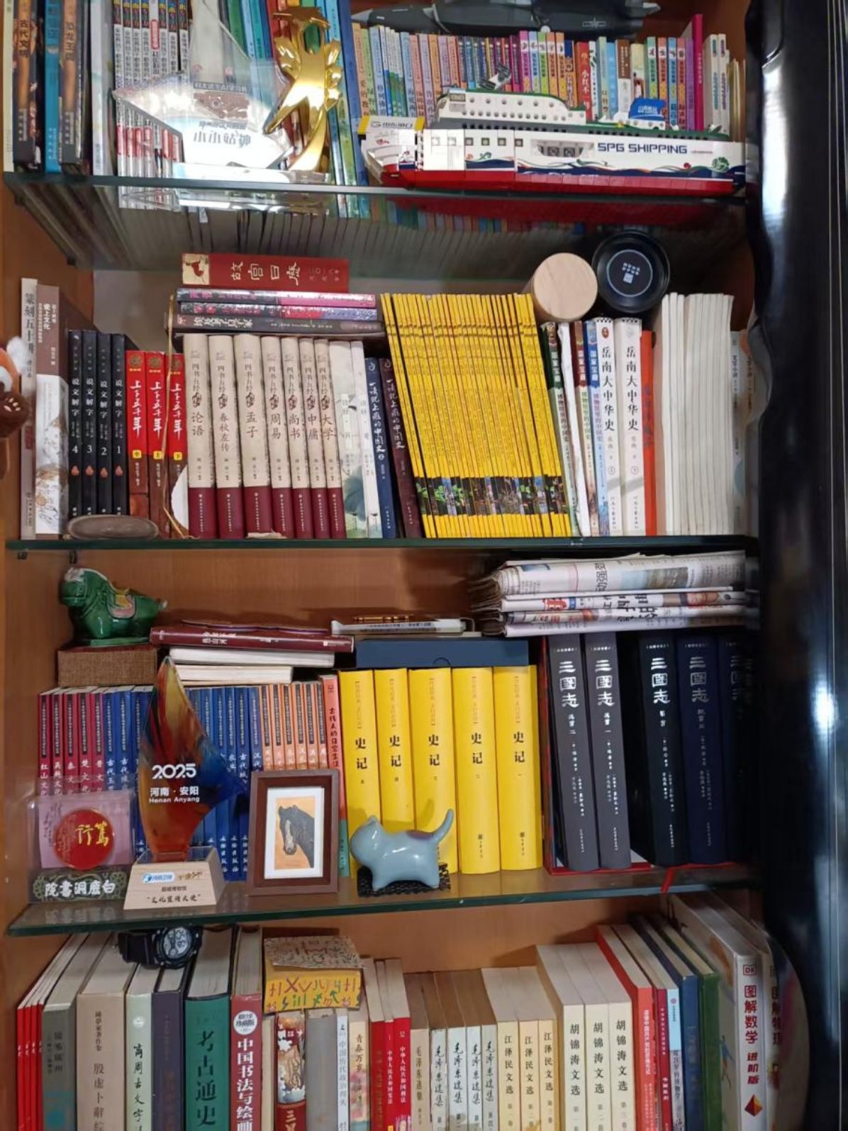 谢昭雨橦的卧室只有十一二平方米,这个不大的空间内,容纳的东西可不少:南面的两个书架上,整整齐齐地码放了数百本书籍,涵盖中国古代、近现代文学,以及历史、文物、自然科普等类别;东面的书架上,不同时期、朝代的文物藏品一排排陈列着;文物与书籍之外不多的空间里,还容纳着一张书桌、一张床,构成了“雨堂博物馆”这方独特的“小天地”。