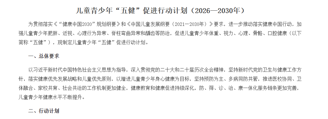 图为国家卫健委等十三部门联合发布《儿童青少年“五健”促进行动计划(2026-2030年)》