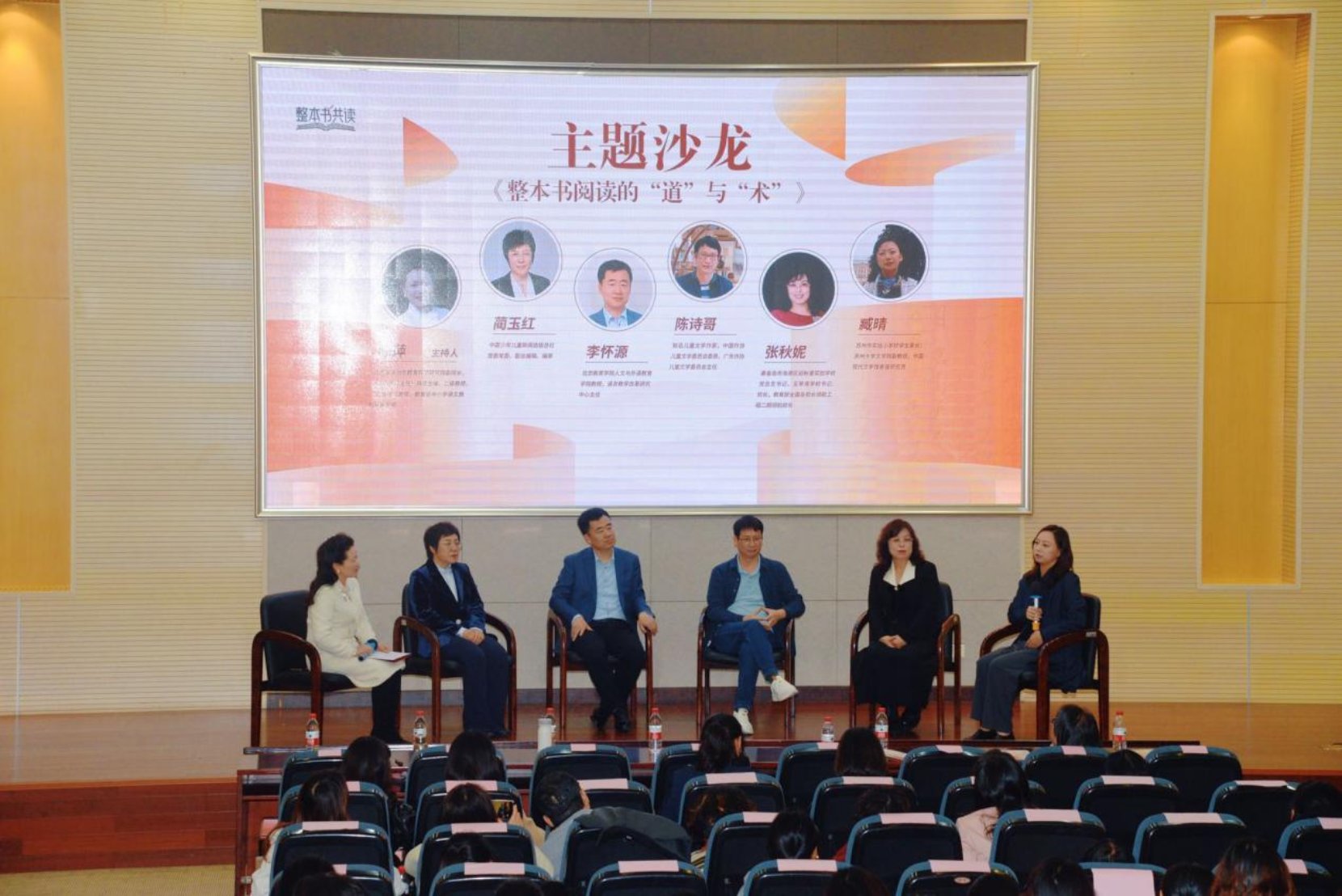主题沙龙环节由中国教育学会班主任专业委员会学术委员会主任、江苏省扬州市教育科学研究院副院长陈萍主持,中国少年儿童新闻出版总社党委常委、副总编辑蔺玉红,北京教育学院人文与外语教育学院教授李怀源,知名儿童文学作家陈诗哥,秦皇岛市海港区玉带湾学校校长张秋妮,苏州市实验小学校学生家长臧晴,分别作为出版专家、教育专家、作家、校长和家长代表就整本书阅读的“道”与“术”进行了深度探讨。