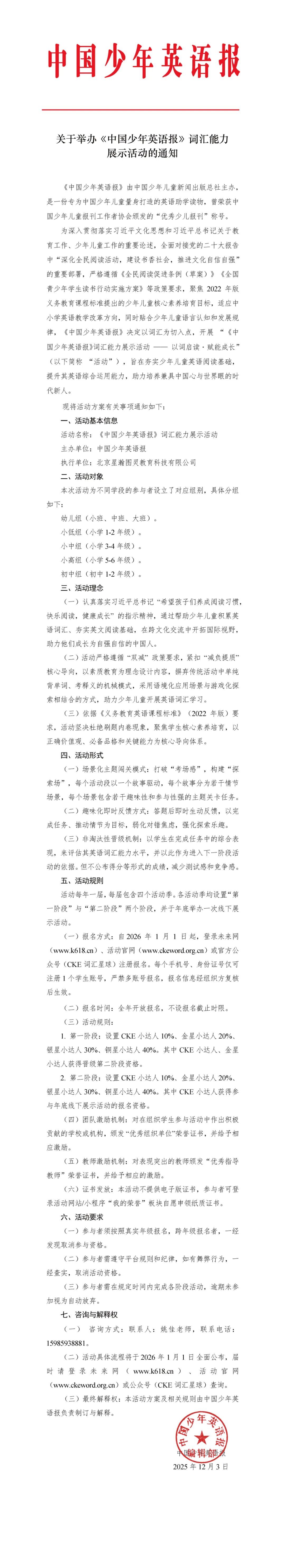 在教育数字化、素质化发展的背景下,本活动的推出具有重要现实意义。它不仅回应了国家“夯实语言根基”“赋能全面发展”的教育导向,更精准对接了家庭对优质英语教育资源的需求。通过构建“权威内容+科学评价+全流程服务”的学习生态,本活动将为全国少年儿童提供规范、公正的能力展示舞台,引导学生重视词汇积累、增强语言自信,助力形成“主动学、乐于展、稳步升”的英语学习良性循环。