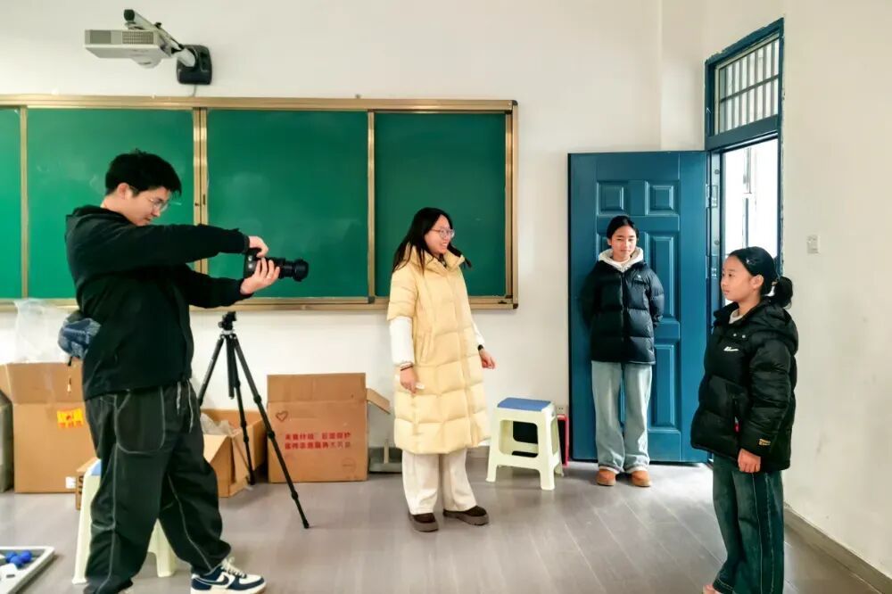 图为梁圣野(左一)和明岩(左二)为孩子们拍摄证件照的场景