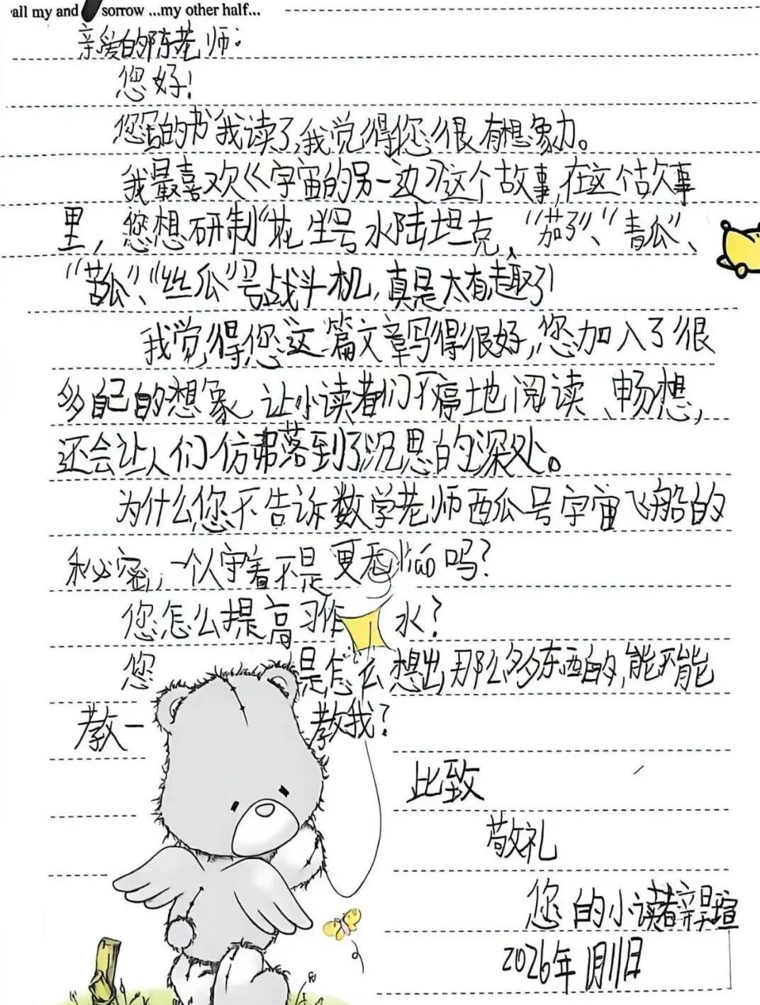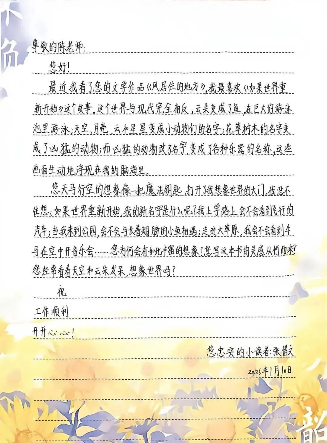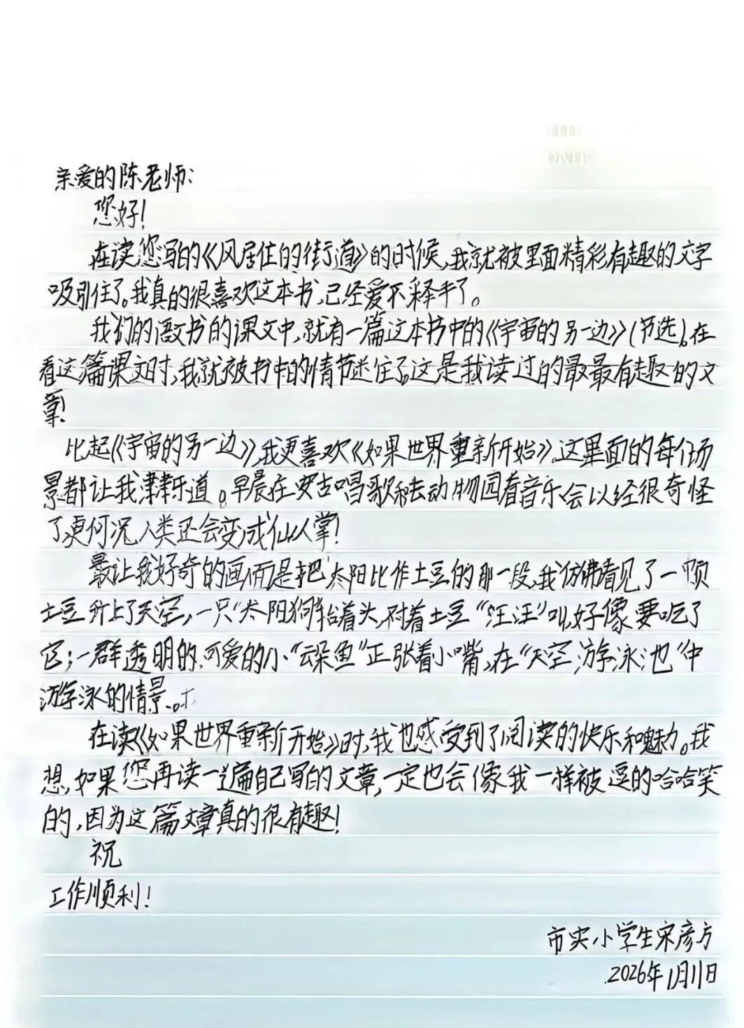活动虽已结束,但孩子们心里的话才刚刚开始。四年级的陆沐诗同学在信中写道:“您的故事不仅有趣,还告诉我很多的道理。我至少要再看三四遍才能停下来。我长大后一定努力,成为和您一样的作家。”张惜文同学则好奇地询问:“您写这本书的灵感从何而来?您经常看着天空和云朵发呆,想象世界吗?”