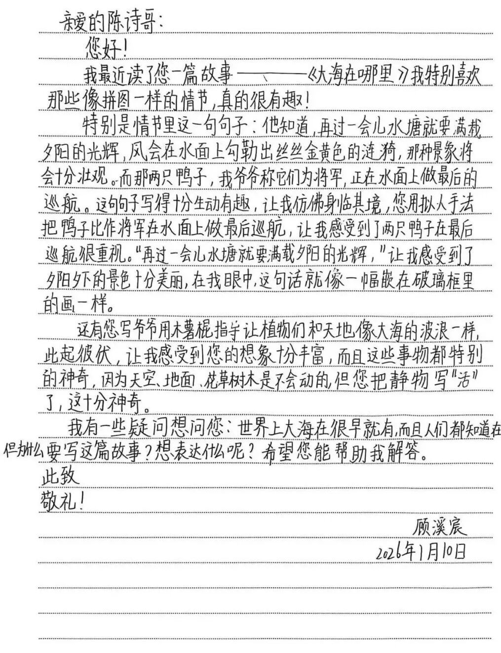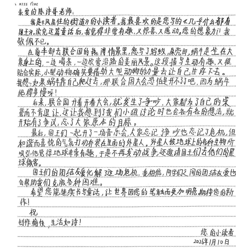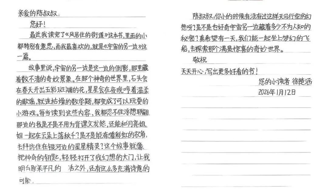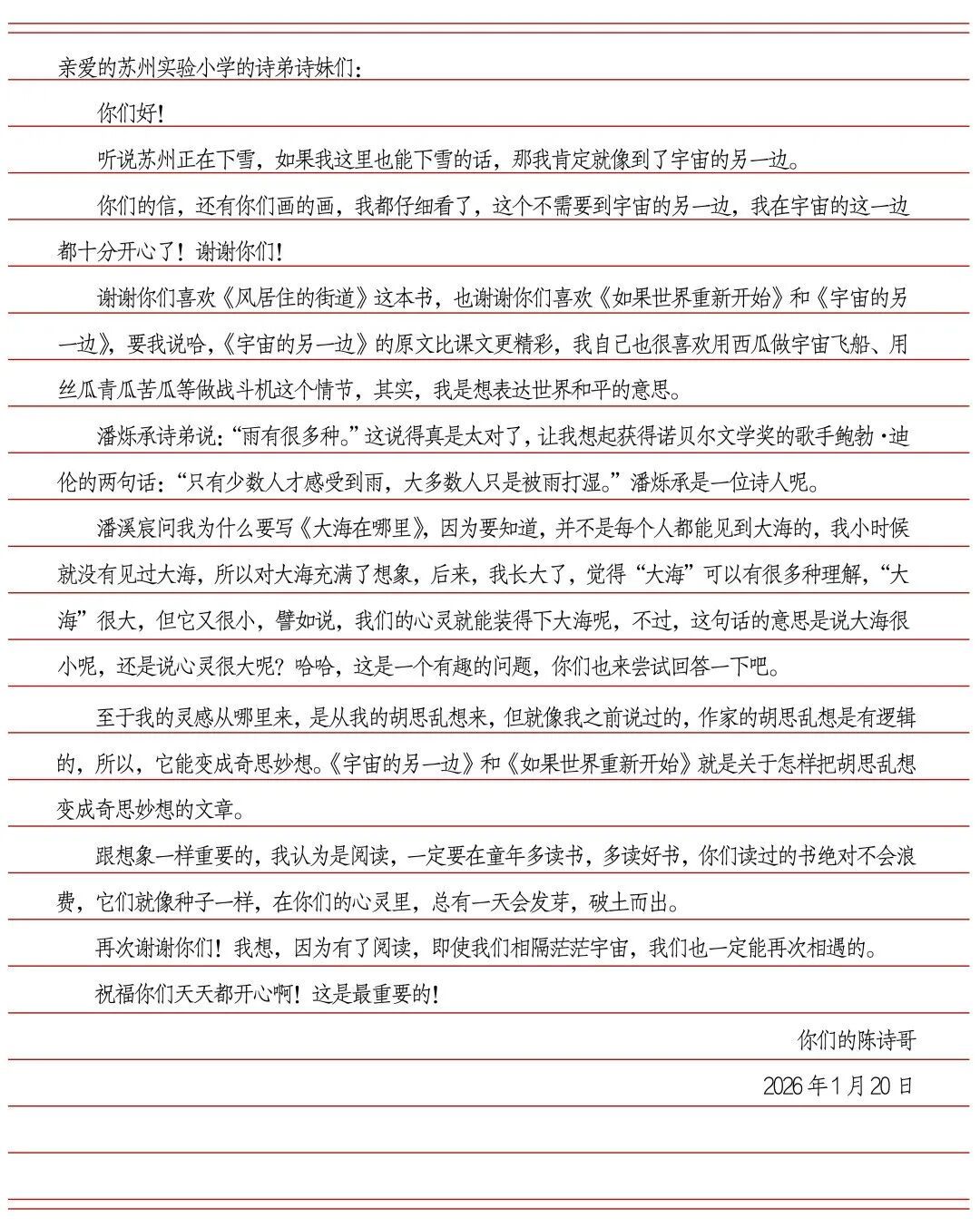 2026年初,苏州实验小学校的孩子们收到了一封特别的回信。写下这行文字的,正是他们不久前在校园里见过面的“大朋友”——著名儿童文学作家陈诗哥。