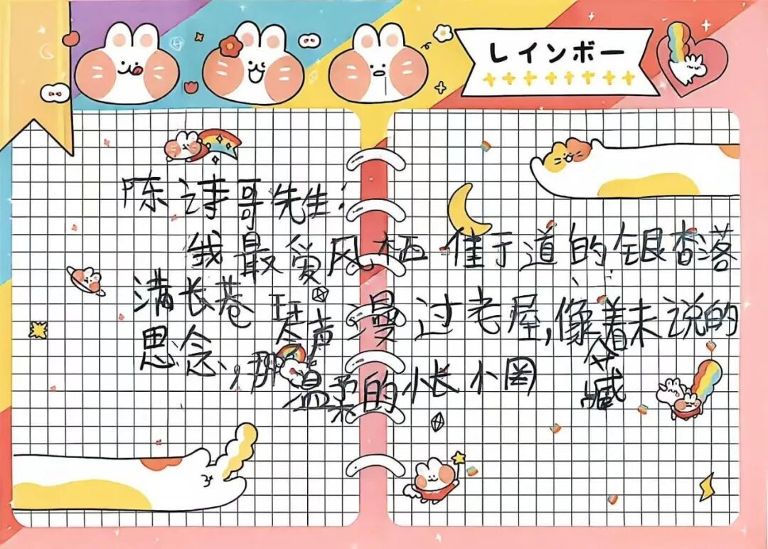 这些稚嫩而真诚的笔迹,打动了陈诗哥。他提笔一一回复。面对潘烁承关于“雨”的思考,他写道:“你说得太对了,让我想起诺贝尔文学奖得主、歌手鲍勃·迪伦的话:'只有少数人才感受到雨,大多数人只是被雨打湿。'你就是那位能感受到雨的小诗人。”
