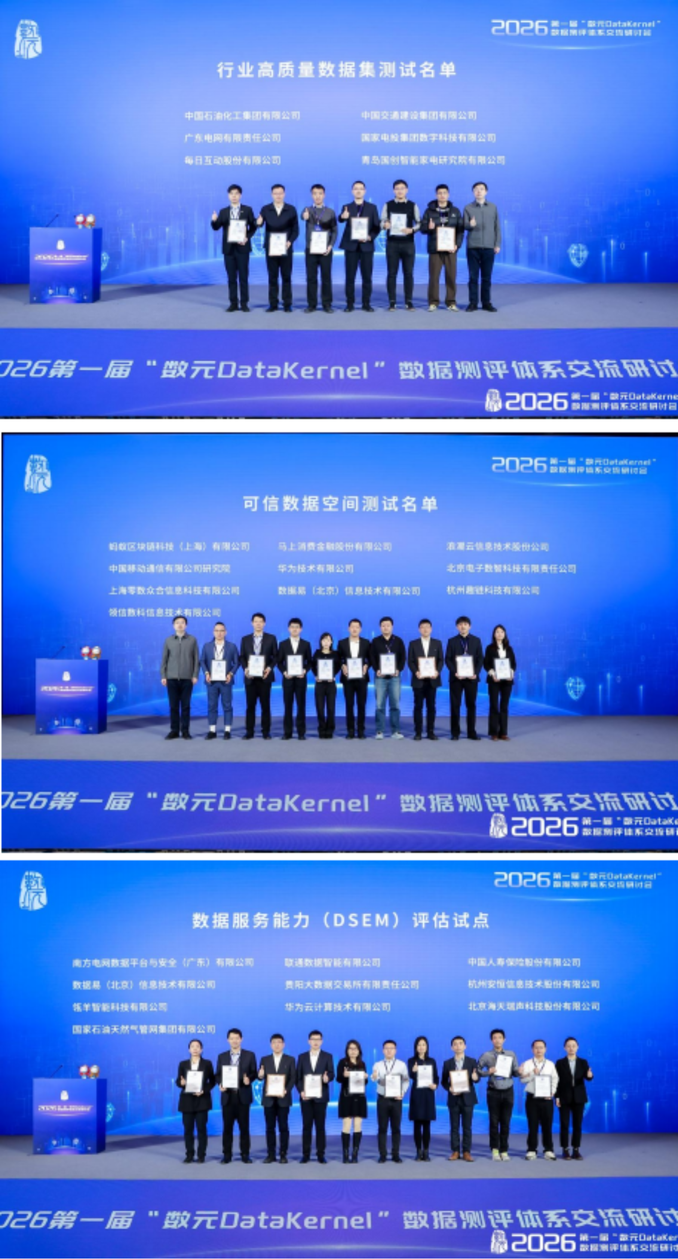 会议期间,向已通过高质量数据集质量测评及可信数据空间测试的单位颁发证书,并同步启动数据服务能力成熟度评估(DSEM)试点。