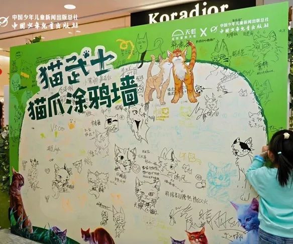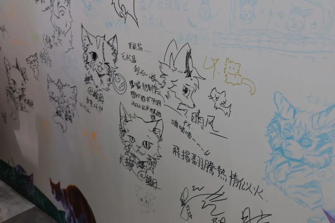 活动现场还设置了“捕猎区”“猫武士考场”等互动游戏区,排起了长队。二楼设有猫爪涂鸦墙,孩子们纷纷展示画艺,引来很多顾客的驻足围观。三楼设有“好感度瓶子与物料交换区”,供“猫迷”们自由交流、收藏。