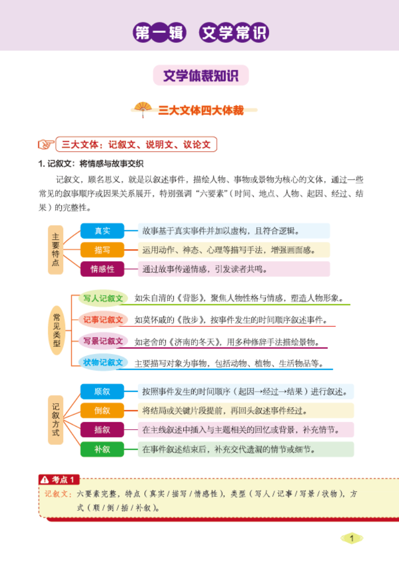 解释说明: 学完立刻练,题目紧扣刚学的“记叙文六要素”“论证方法”等考点,即时检验学习效果,巩固记忆。