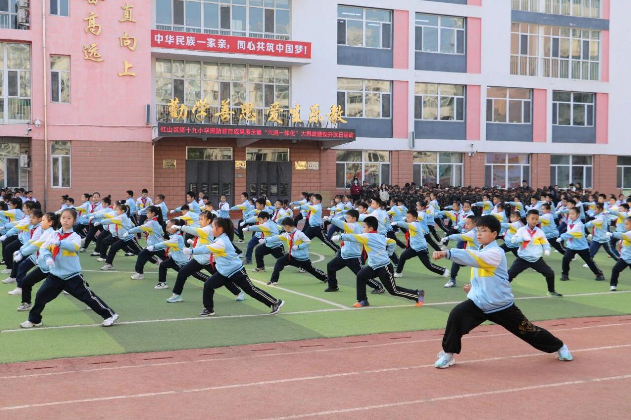 类似这样的探索正在红山区各校园遍地开花:在红山区第十五小学,“礼节”“节气”“中草药”等特色课程让传统文化可感、可触、可参与;在红山区第十九小学,旗语操、武术操和军体拳则将红色基因融入一招一式,成为学生日常生活的一部分。