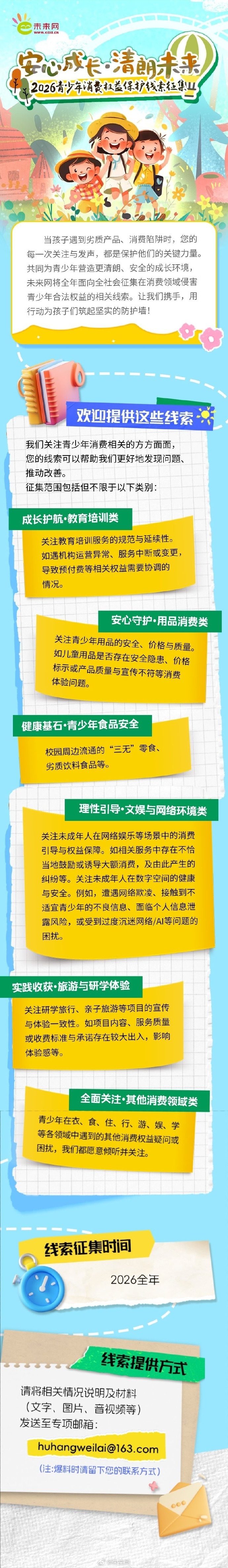 当孩子遇到劣质产品、消费陷阱时,您的每一次关注与发声,都是保护他们的关键力量。共同为青少年营造更清朗、安全的成长环境,未来网将全年面向全社会征集在消费领域侵害青少年合法权益的相关线索。请发送线索到邮箱huhangweilai@163.com ,让我们携手,用行动为孩子们筑起坚实的防护墙!