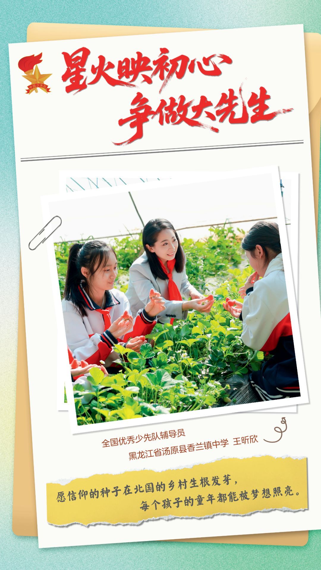 在共青团中央少年部、教育部教师工作司共同指导下,本报开设 《星火映初心 争做大先生》专栏。 我们诚邀广大少先队辅导员 和少先队工作者,共同讲述关于理想、执着、成长与爱的动人故事。愿这些一线的真实心声,激荡起四海同频的回响,让教育家精神在每一位同行者心中扎根、生长。