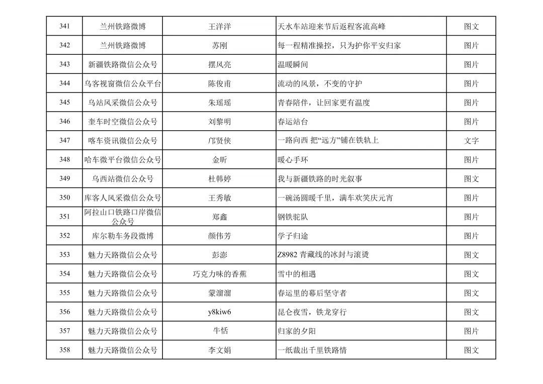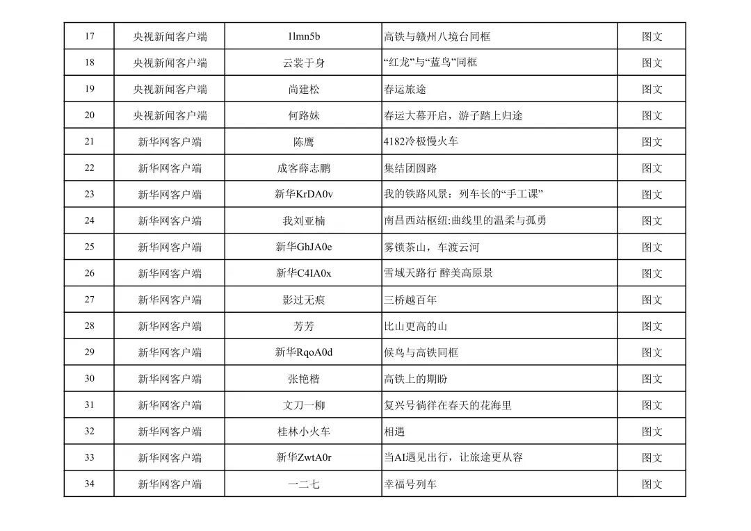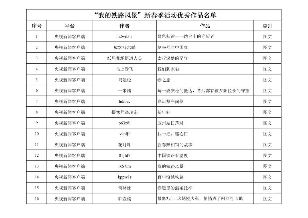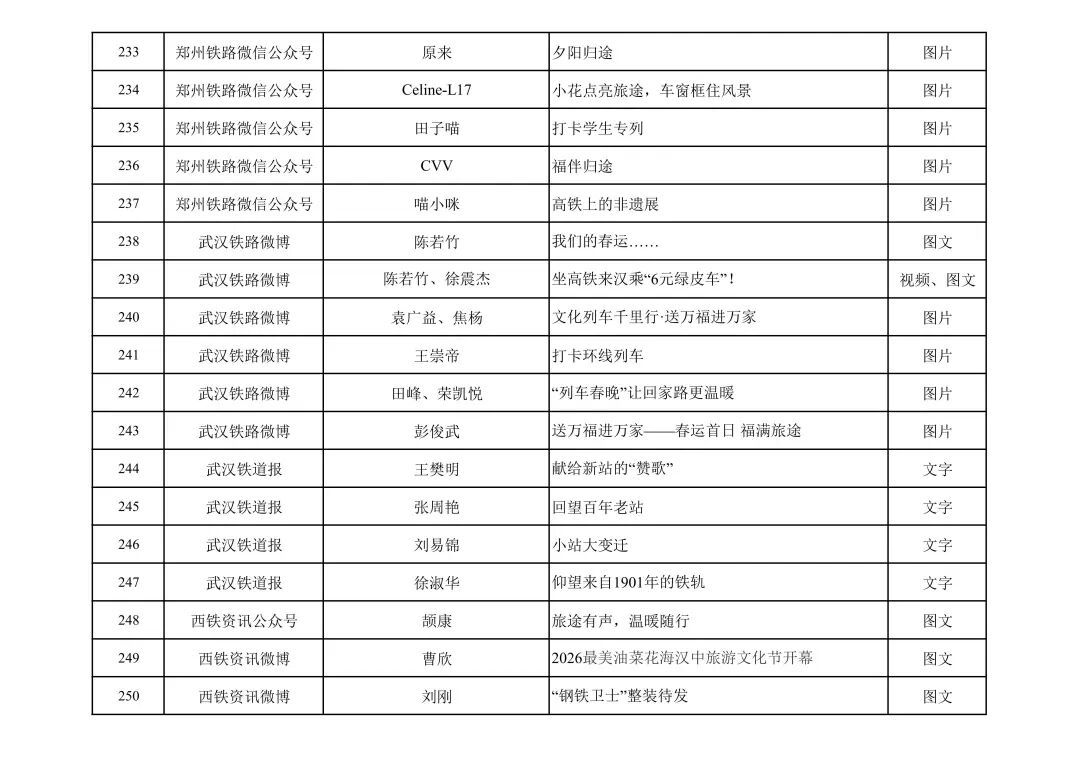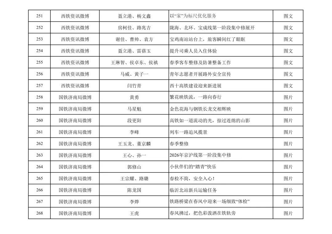 4月9日,由中宣部文明创建局、中央网信办网络传播局、广电总局宣传司、文化和旅游部资源开发司、中国文联国内联络部、中国作协创作联络部、中国国家铁路集团有限公司党组宣传部联合举办的2026年“我的铁路风景”主题宣传新春季活动优秀作品名单公布,共362件。