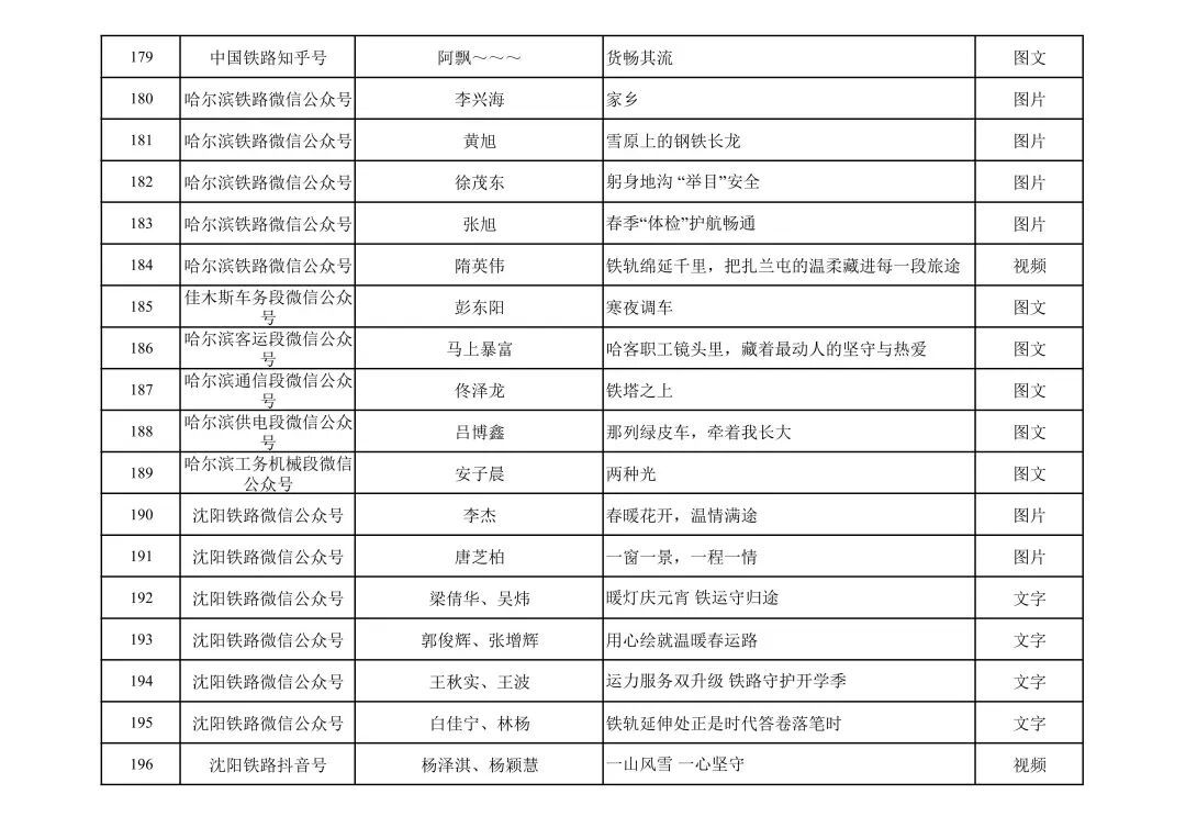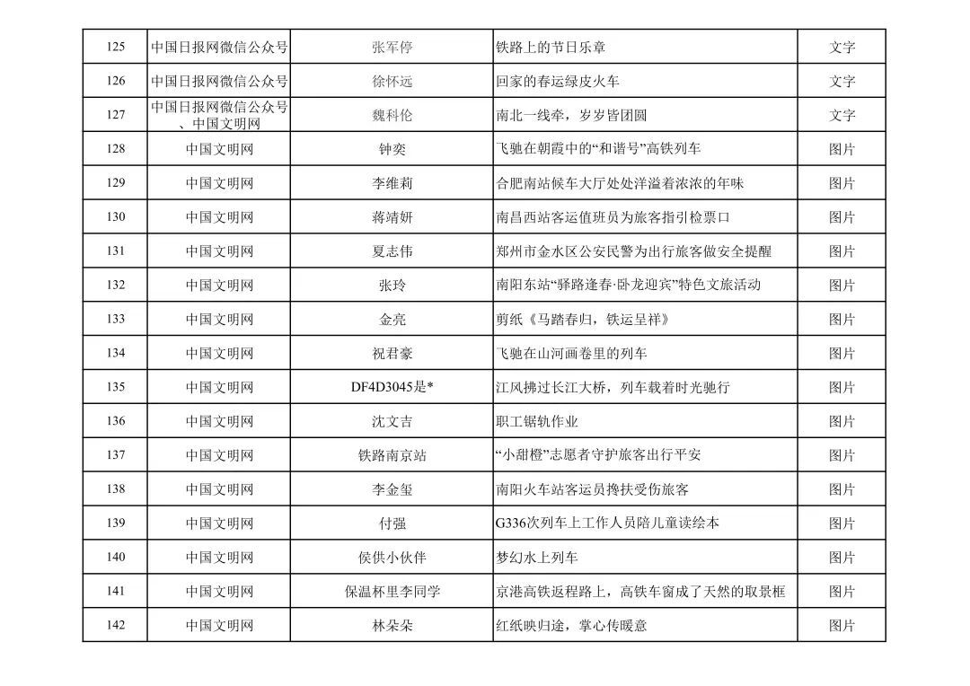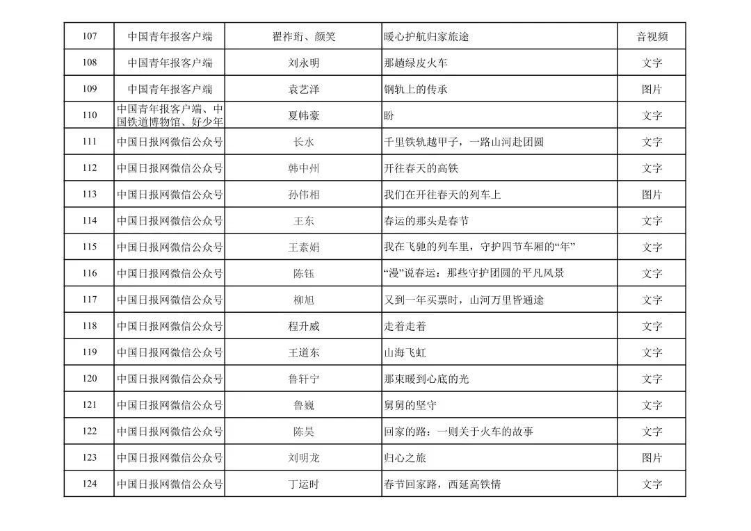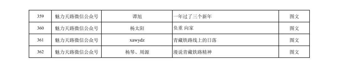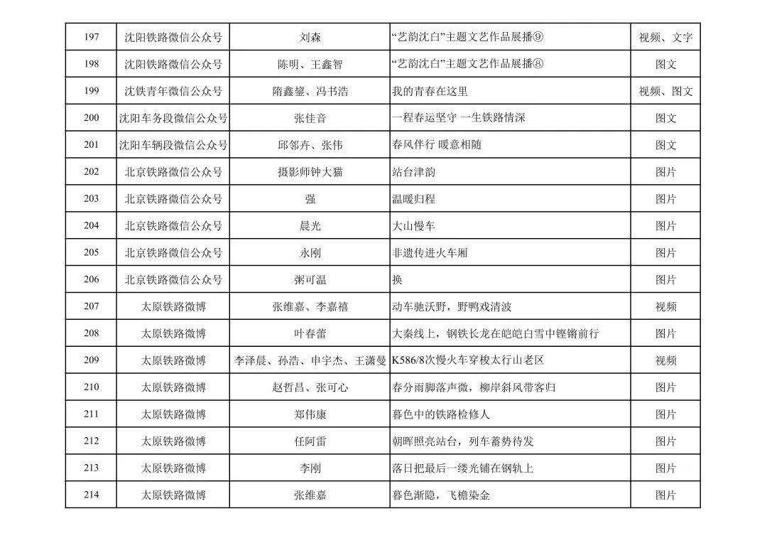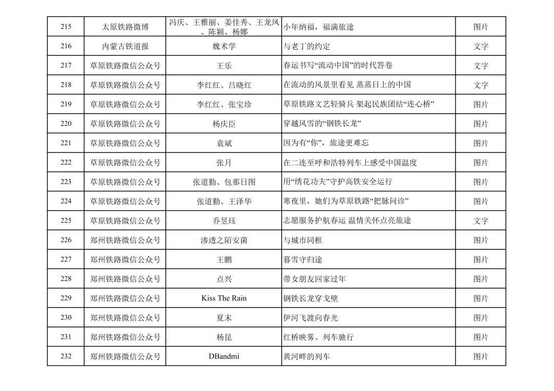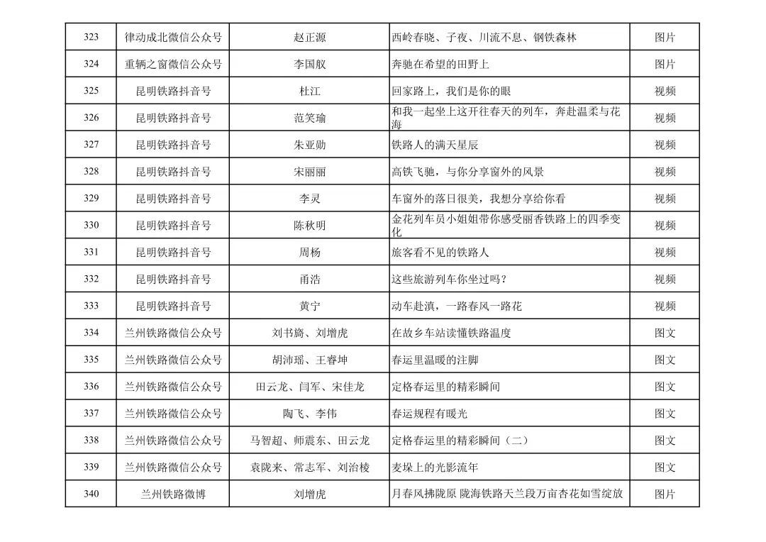 4月9日,由中宣部文明创建局、中央网信办网络传播局、广电总局宣传司、文化和旅游部资源开发司、中国文联国内联络部、中国作协创作联络部、中国国家铁路集团有限公司党组宣传部联合举办的2026年“我的铁路风景”主题宣传新春季活动优秀作品名单公布,共362件。