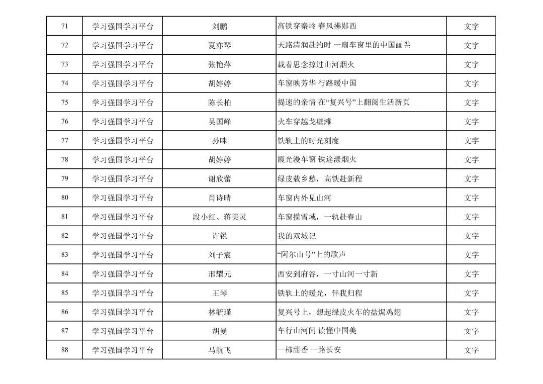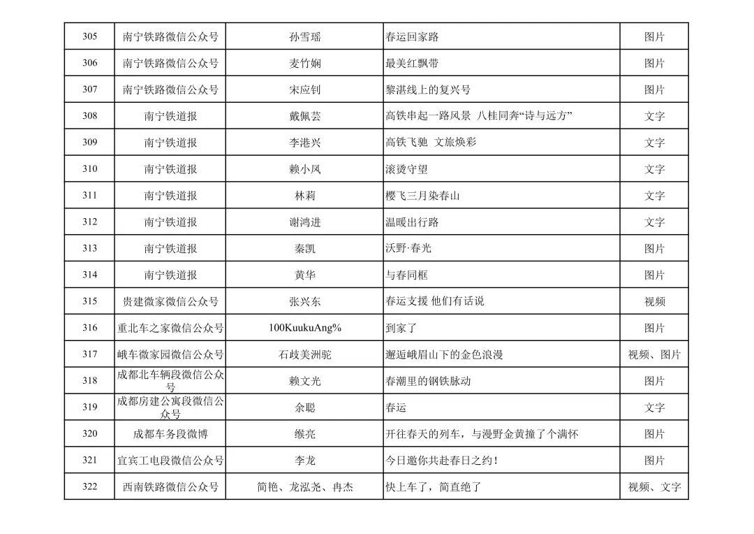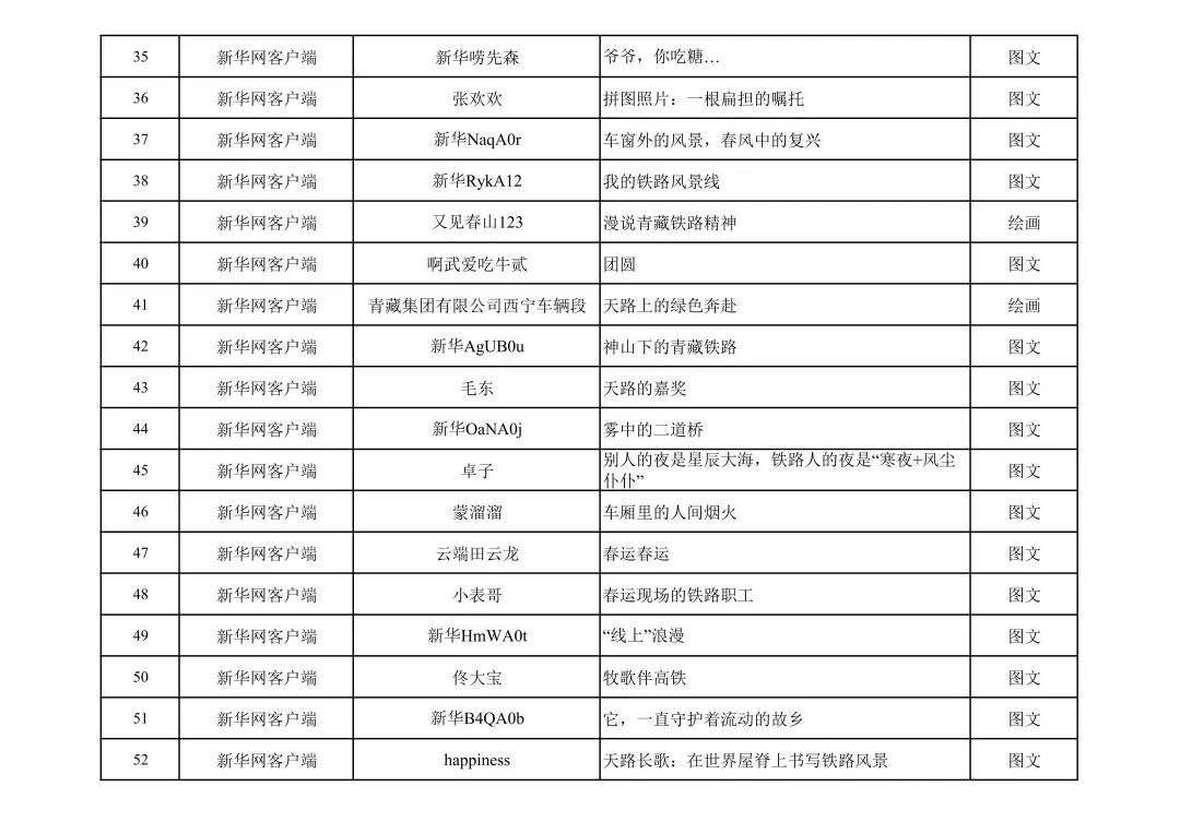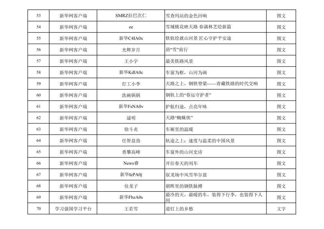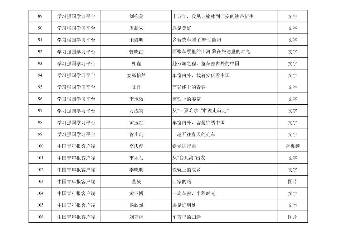 4月9日,由中宣部文明创建局、中央网信办网络传播局、广电总局宣传司、文化和旅游部资源开发司、中国文联国内联络部、中国作协创作联络部、中国国家铁路集团有限公司党组宣传部联合举办的2026年“我的铁路风景”主题宣传新春季活动优秀作品名单公布,共362件。