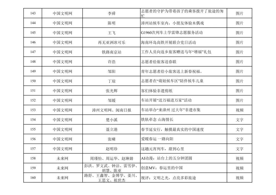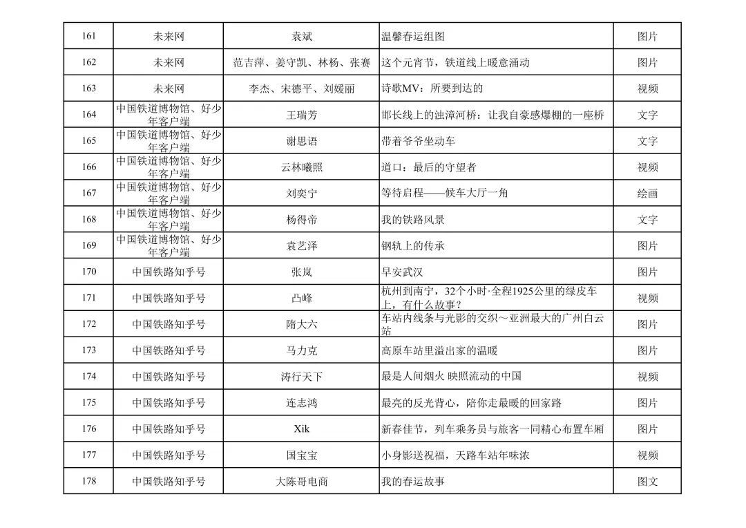 新春季活动自今年1月30日起至3月31日结束,历时60天。广大旅客、网友积极参与,用镜头与笔触记录旅途风景、定格温暖瞬间。各承办平台精心策划组织,共征集到原创作品10万余个,遴选展示精品2.5万余个。近期,央视新闻、新华网、中国青年报、“好少年”客户端,“学习强国”学习平台、中国日报网、中国文明网、未来网,“中国铁路”全媒体矩阵等承办平台,对遴选展示的作品进行了阅评,经活动组委会认定,最终产生了362件优秀作品。